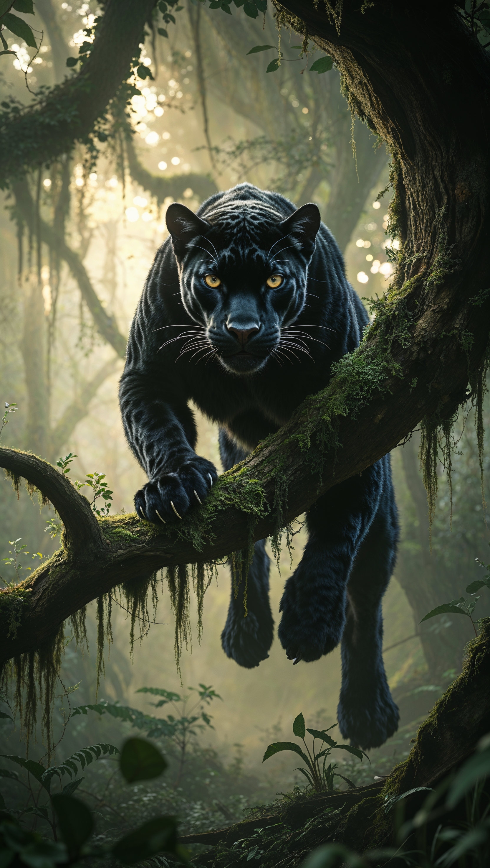 1664x2944 Realistic Black Panther crouching on a tree in the jungle, moody lighting, 4K wallpaper
