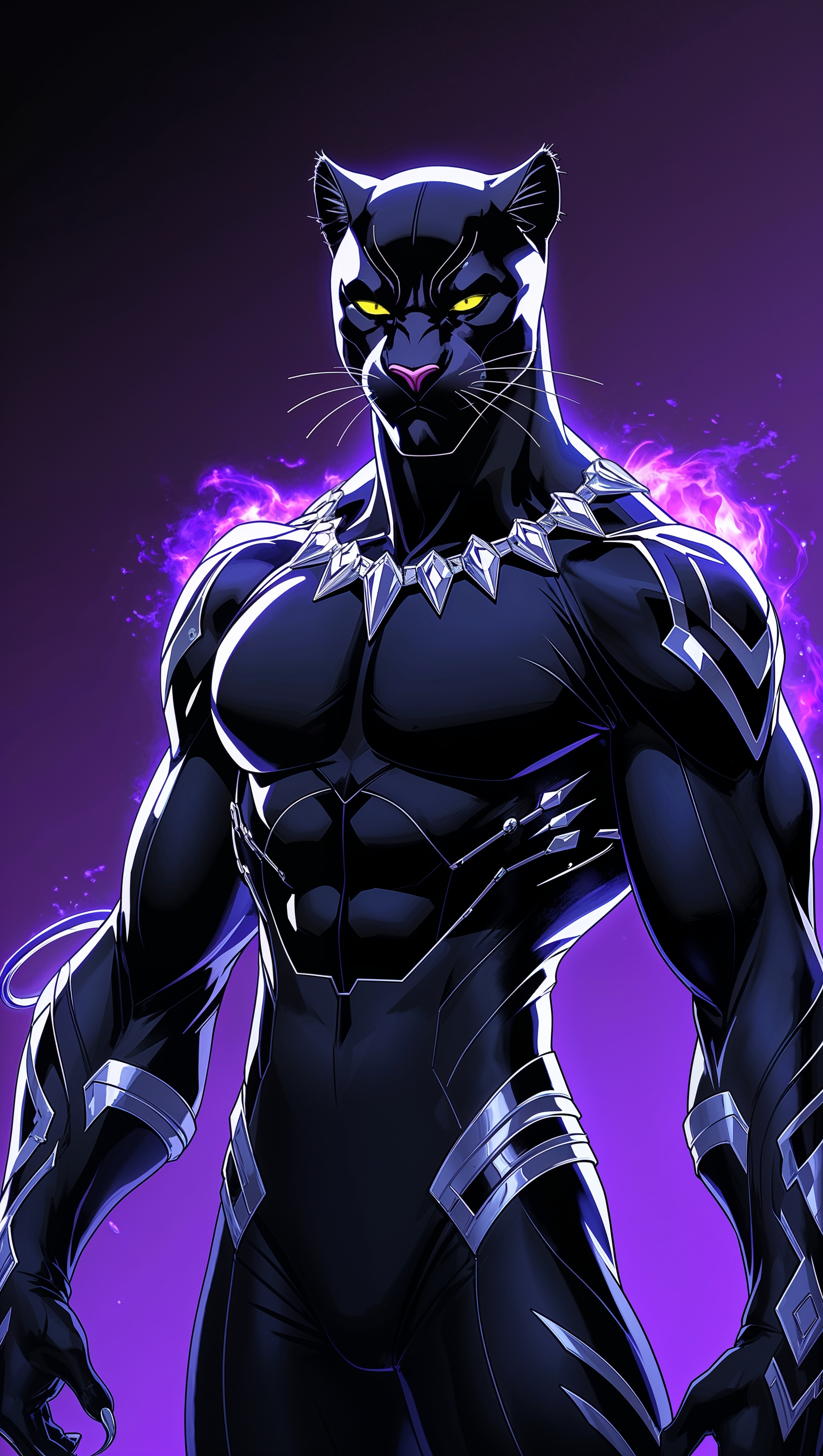 1664x2944 Anime-style Black Panther character, purple glow, wallpaper for iPhone