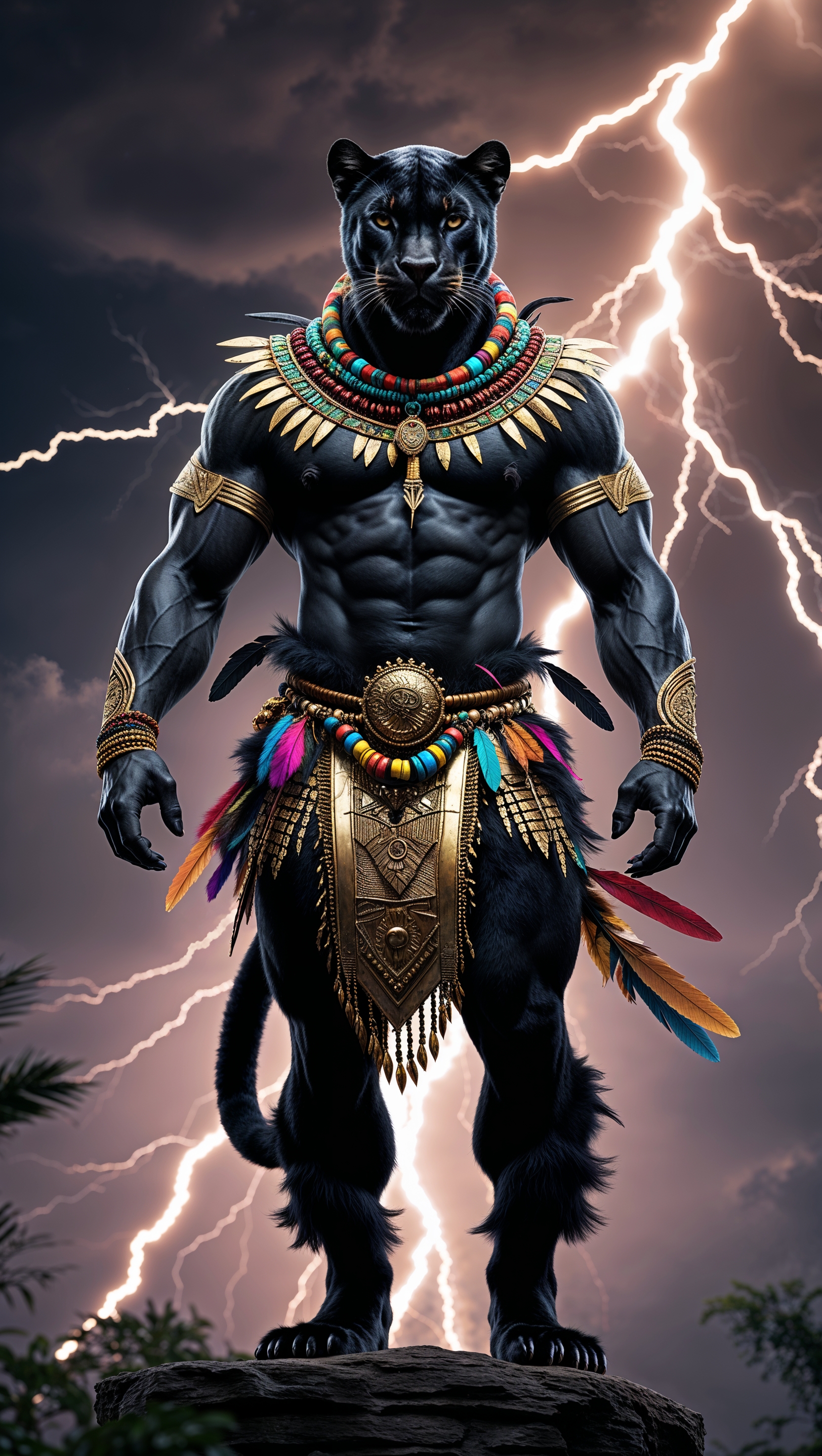 1664x2944 Black Panther in tribal armor, standing with lightning behind him, epic style