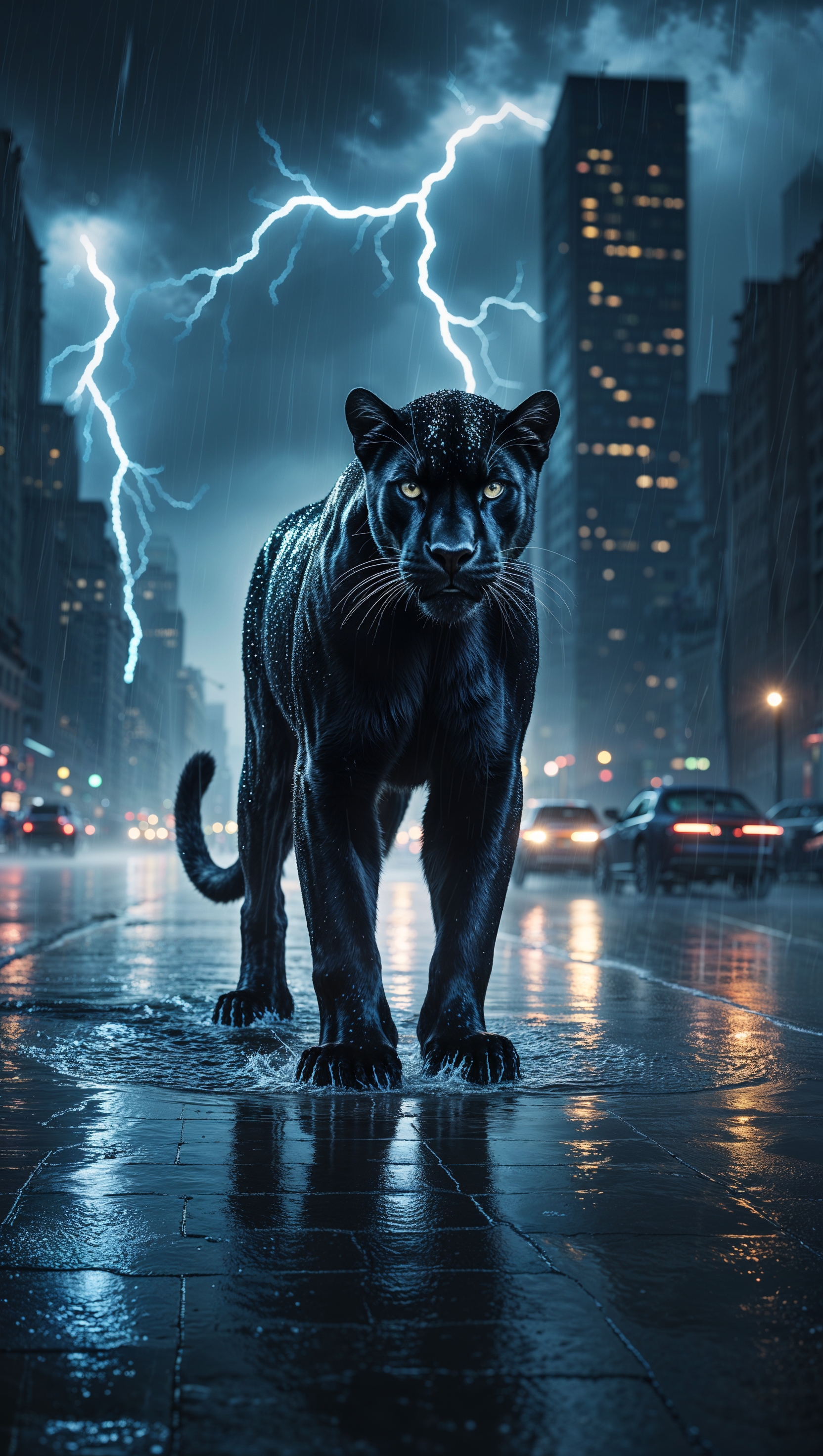 1664x2944 Black Panther standing in rain, dramatic lighting, rainy night theme