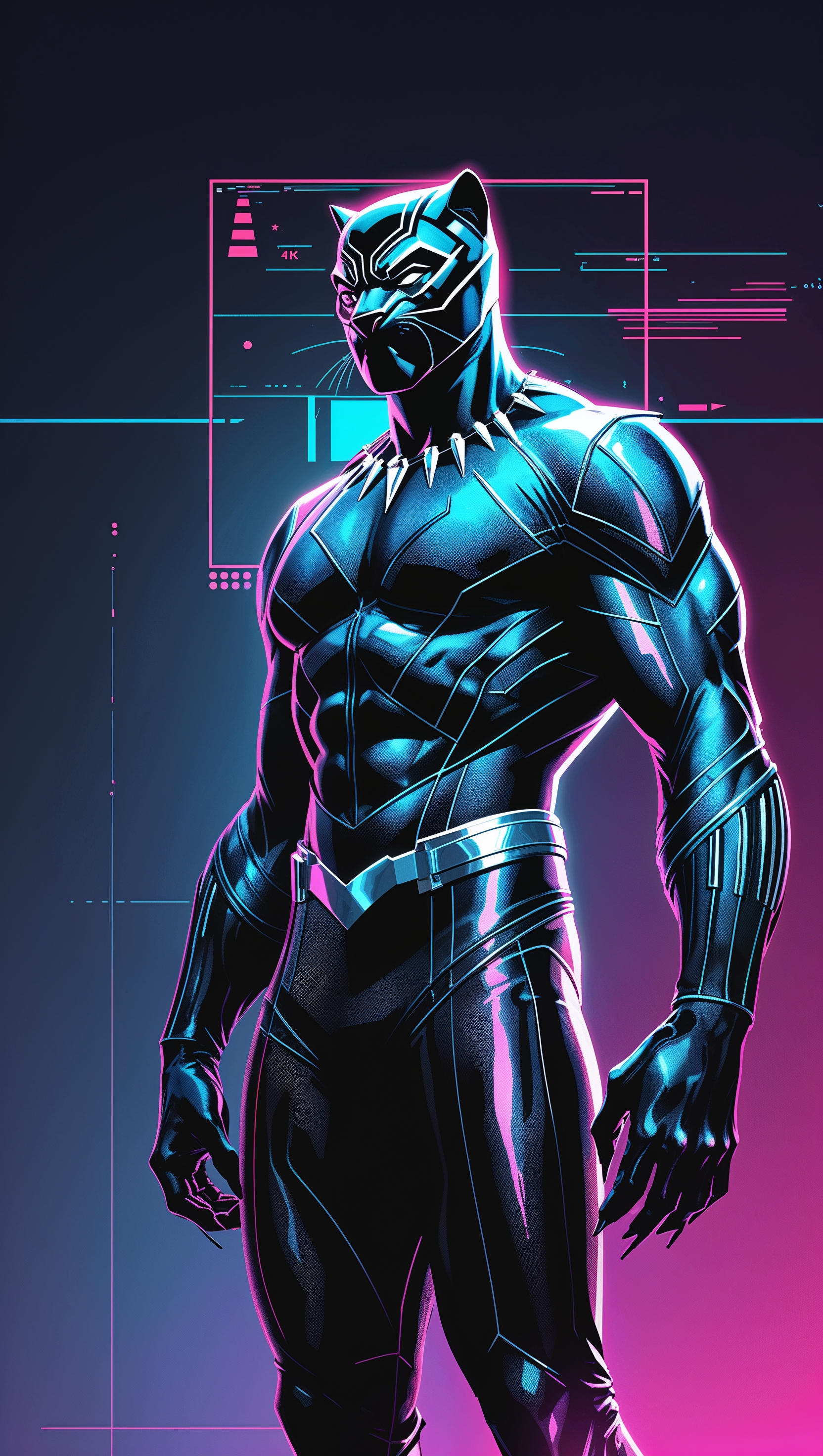1664x2944 Retro 80s style Black Panther with neon lights and VHS effect