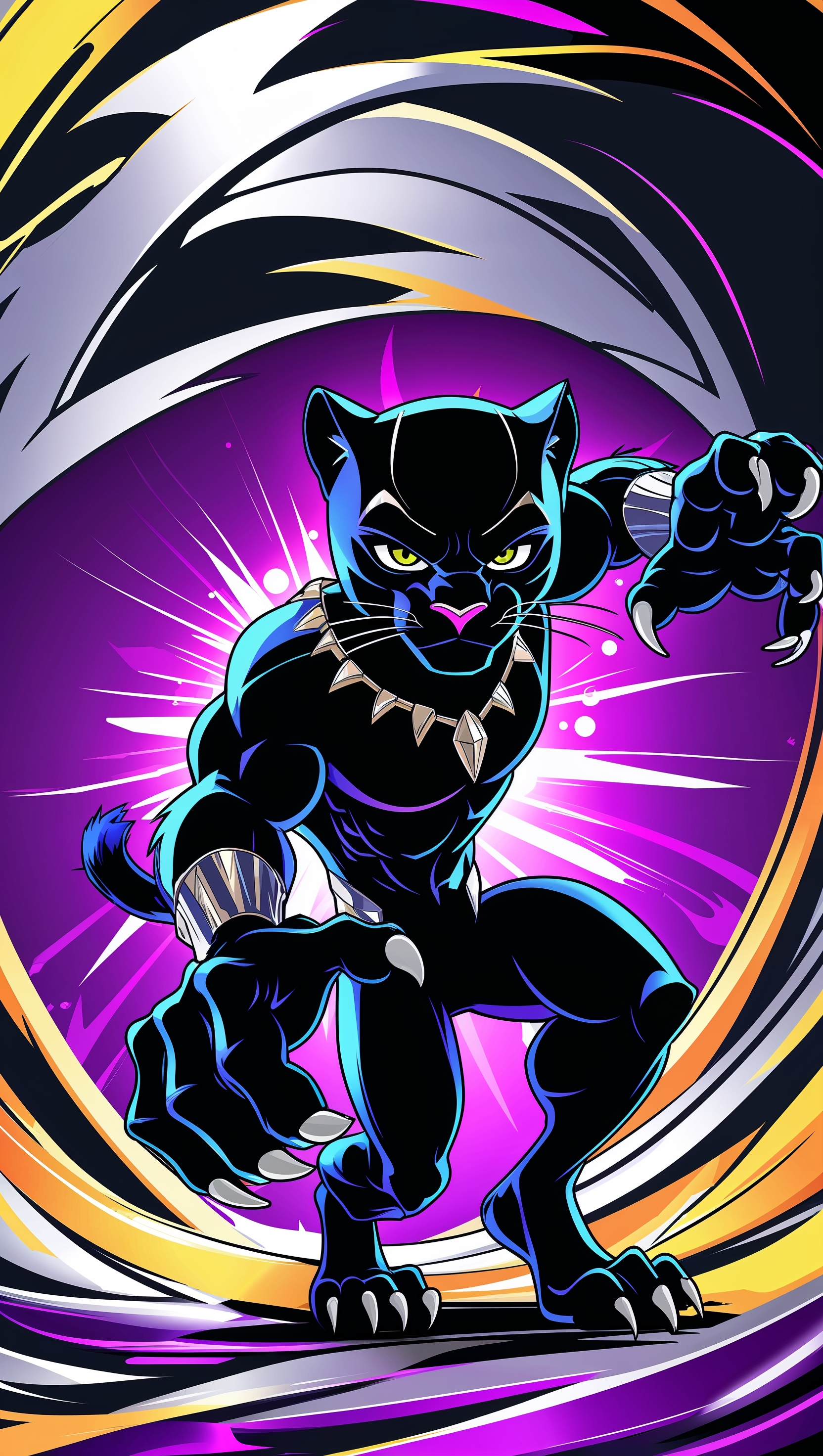1664x2944 Cartoon Black Panther in action pose, vibrant colors, cute wallpaper for iPhone