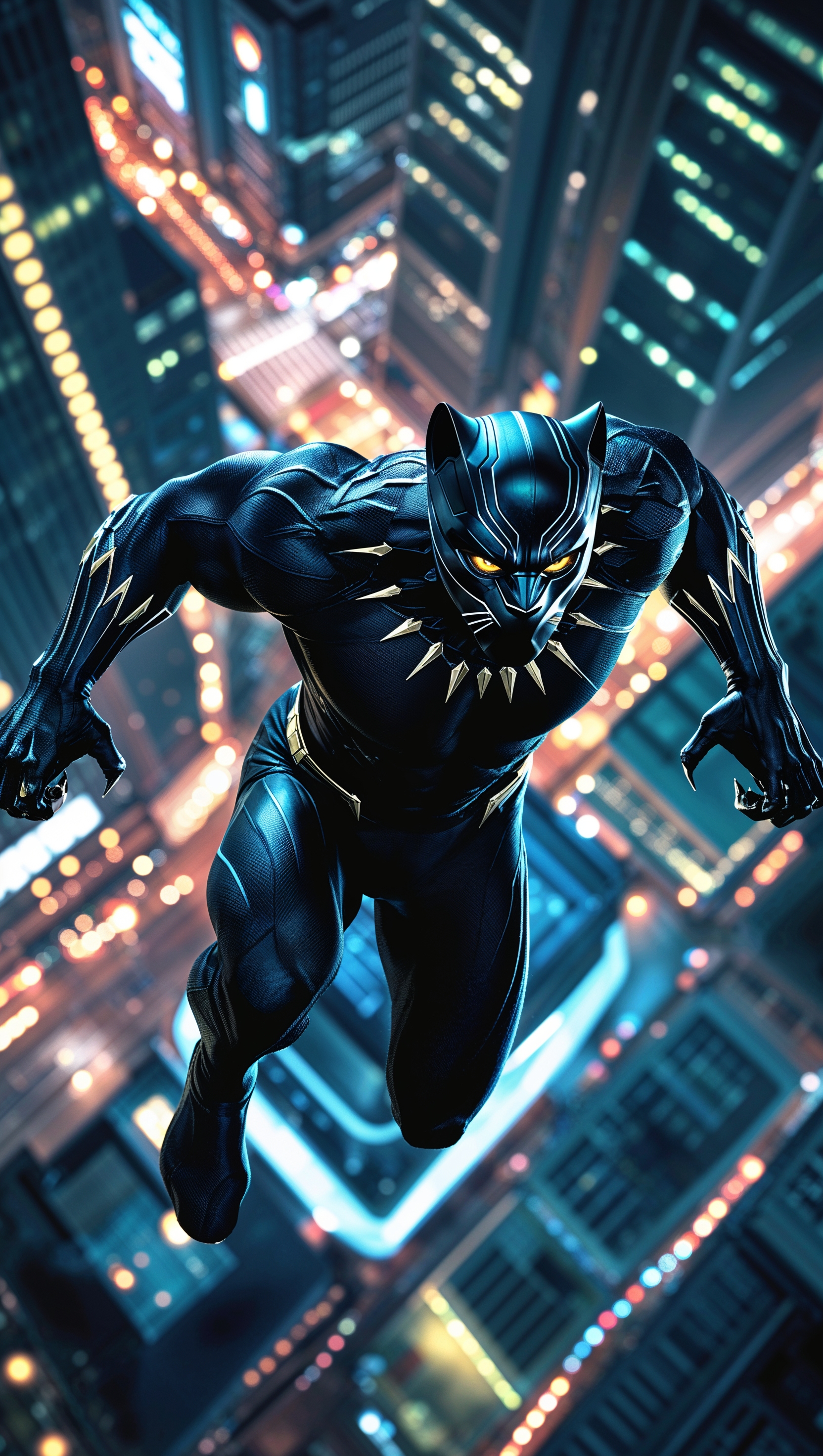 1664x2944 Black Panther jumping from a skyscraper at night, cinematic style