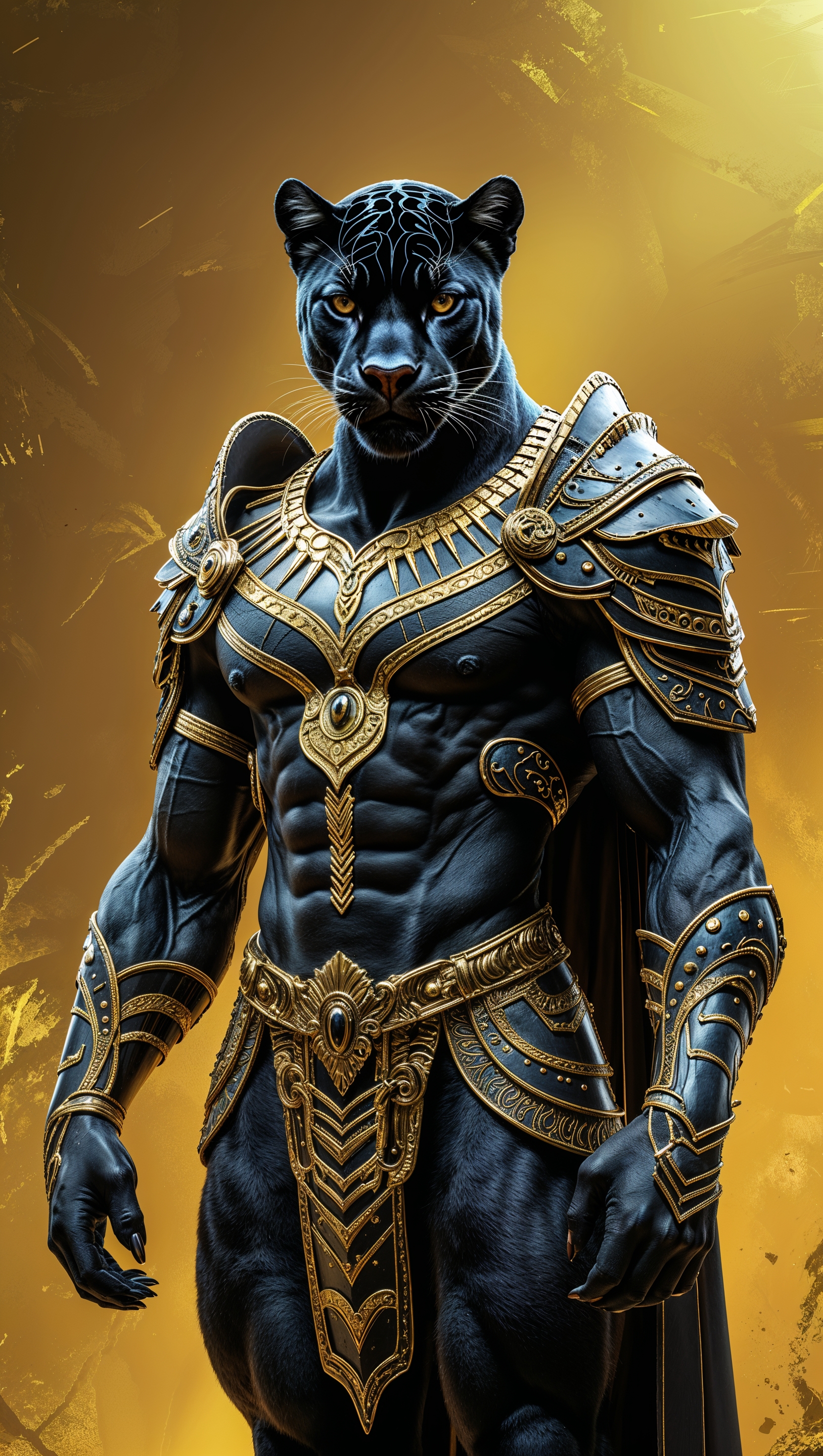 1664x2944 Black Panther in golden armor, glowing background, majestic vibe