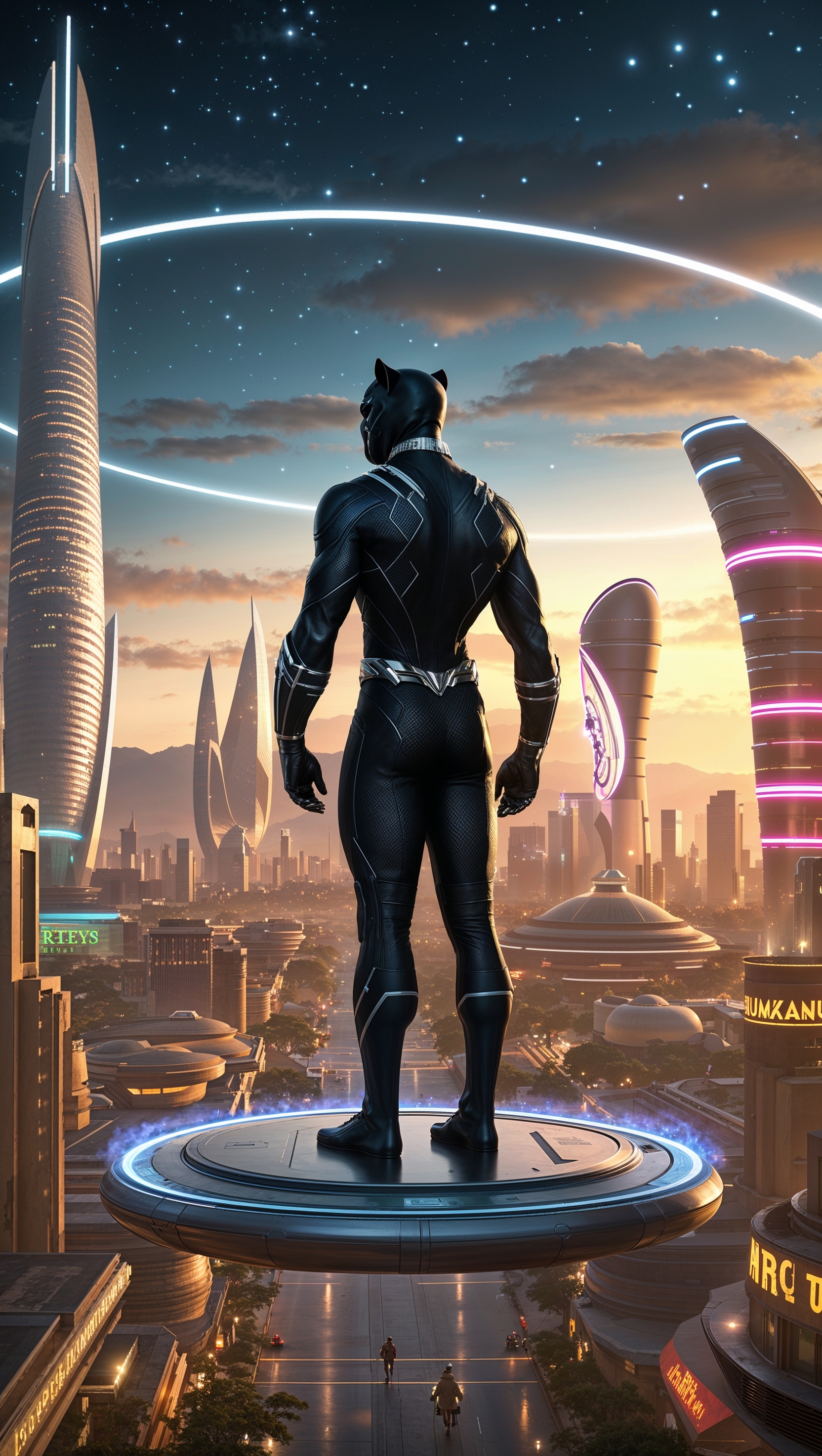 1664x2944 Black Panther looking over a futuristic Wakanda, sci-fi feel