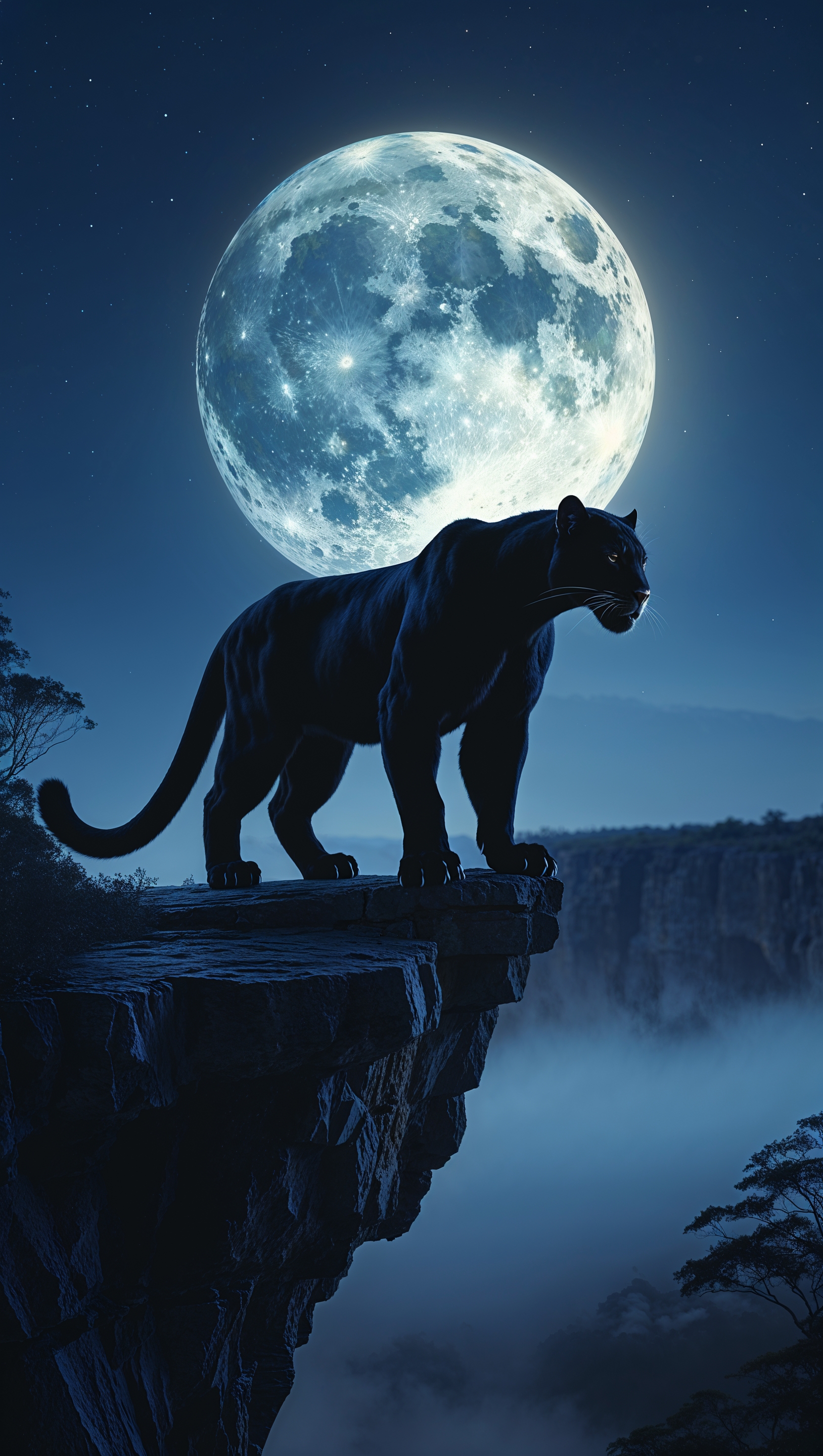 1664x2944 Silhouette of Black Panther on a cliff, moon behind him, peaceful night
