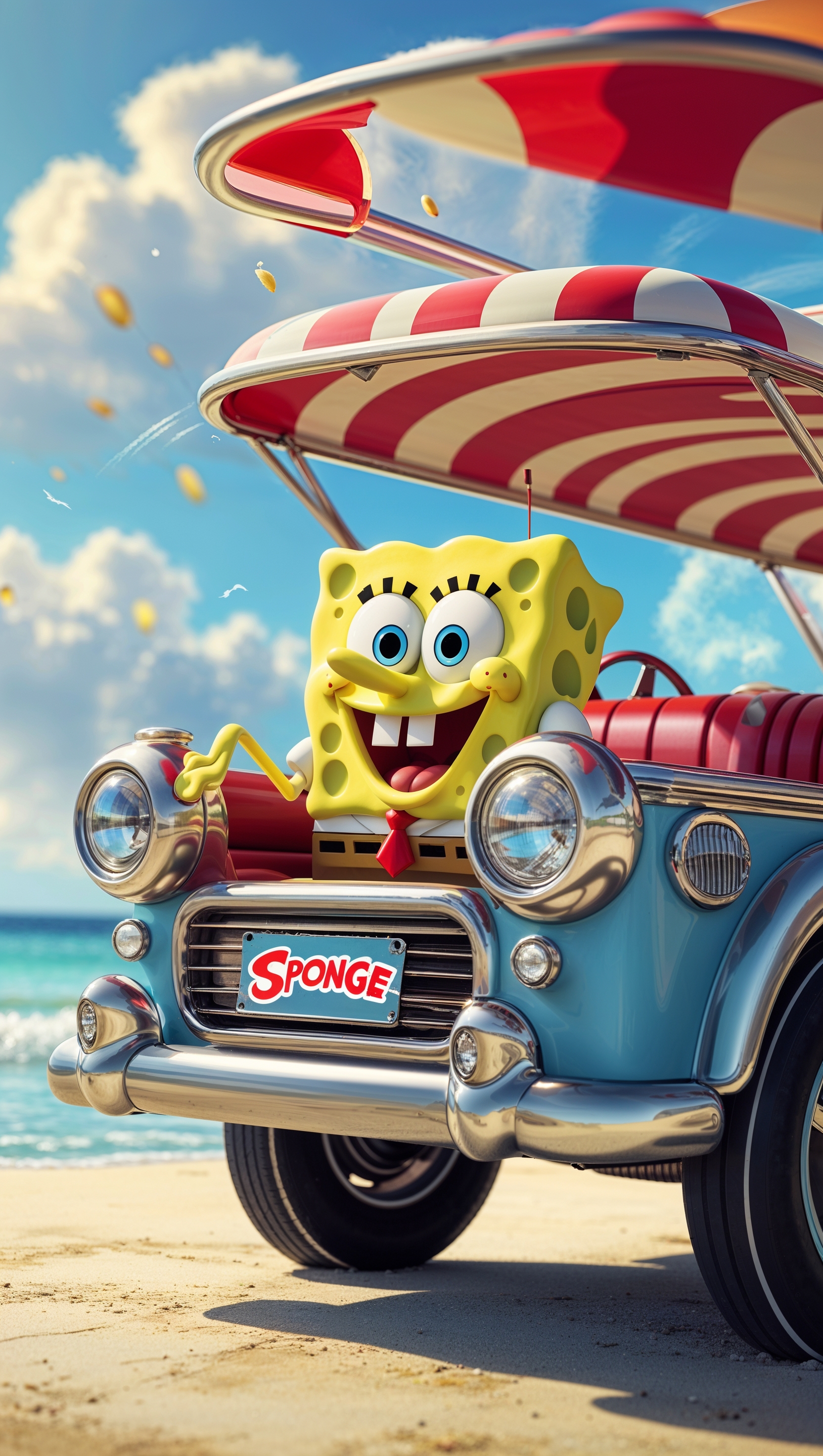 1664x2944 Spongebob driving a boatmobile in vintage style for iPhone wallpaper