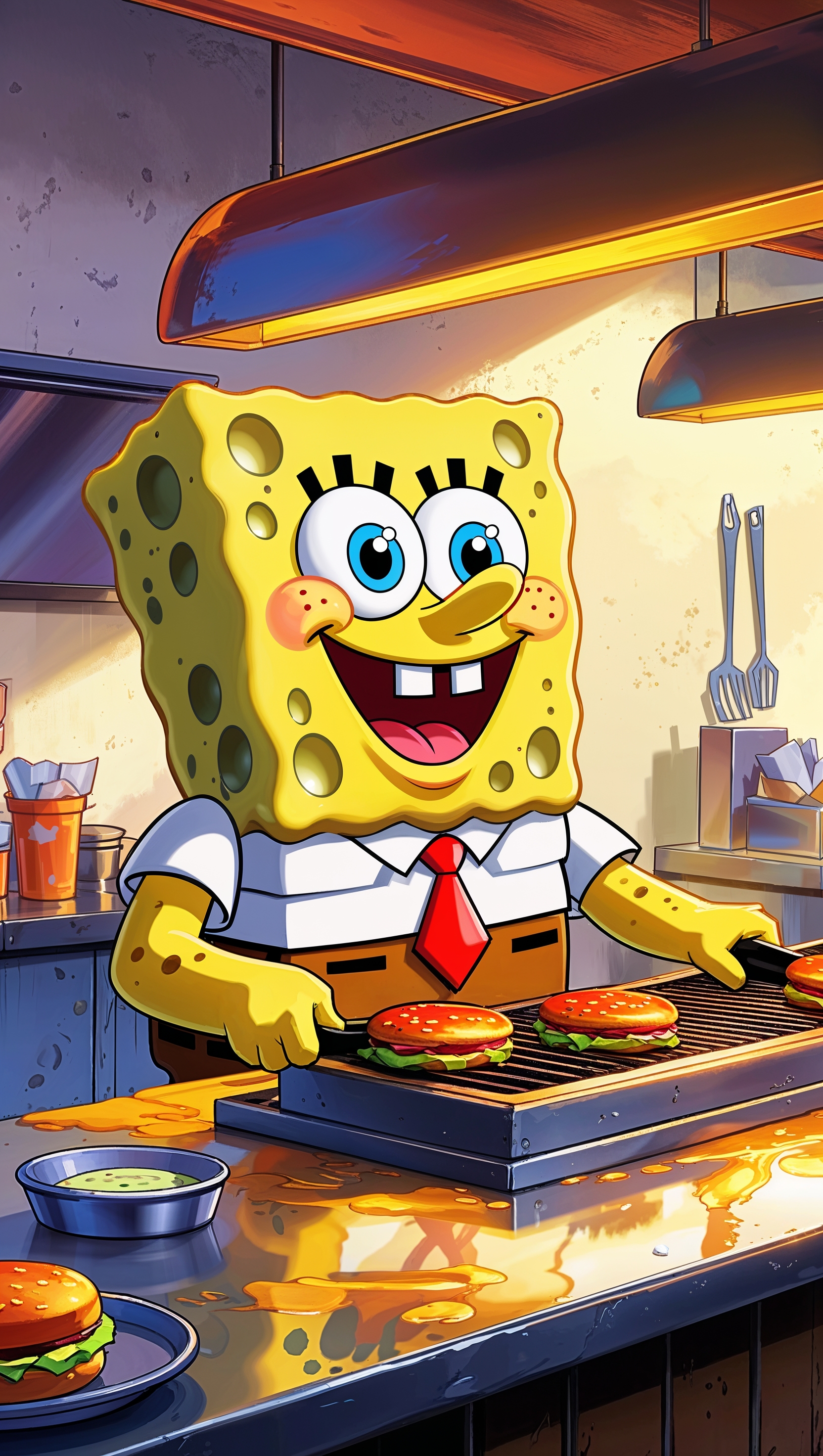 1664x2944 Spongebob cooking burgers at the Krusty Krab with warm lighting for iPhone wallpaper