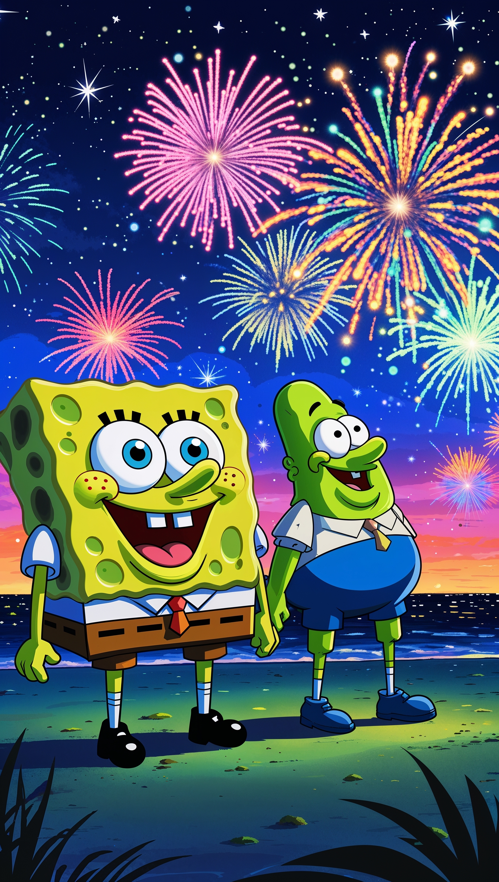 1664x2944 Spongebob watching fireworks at night with Patrick for iPhone wallpaper