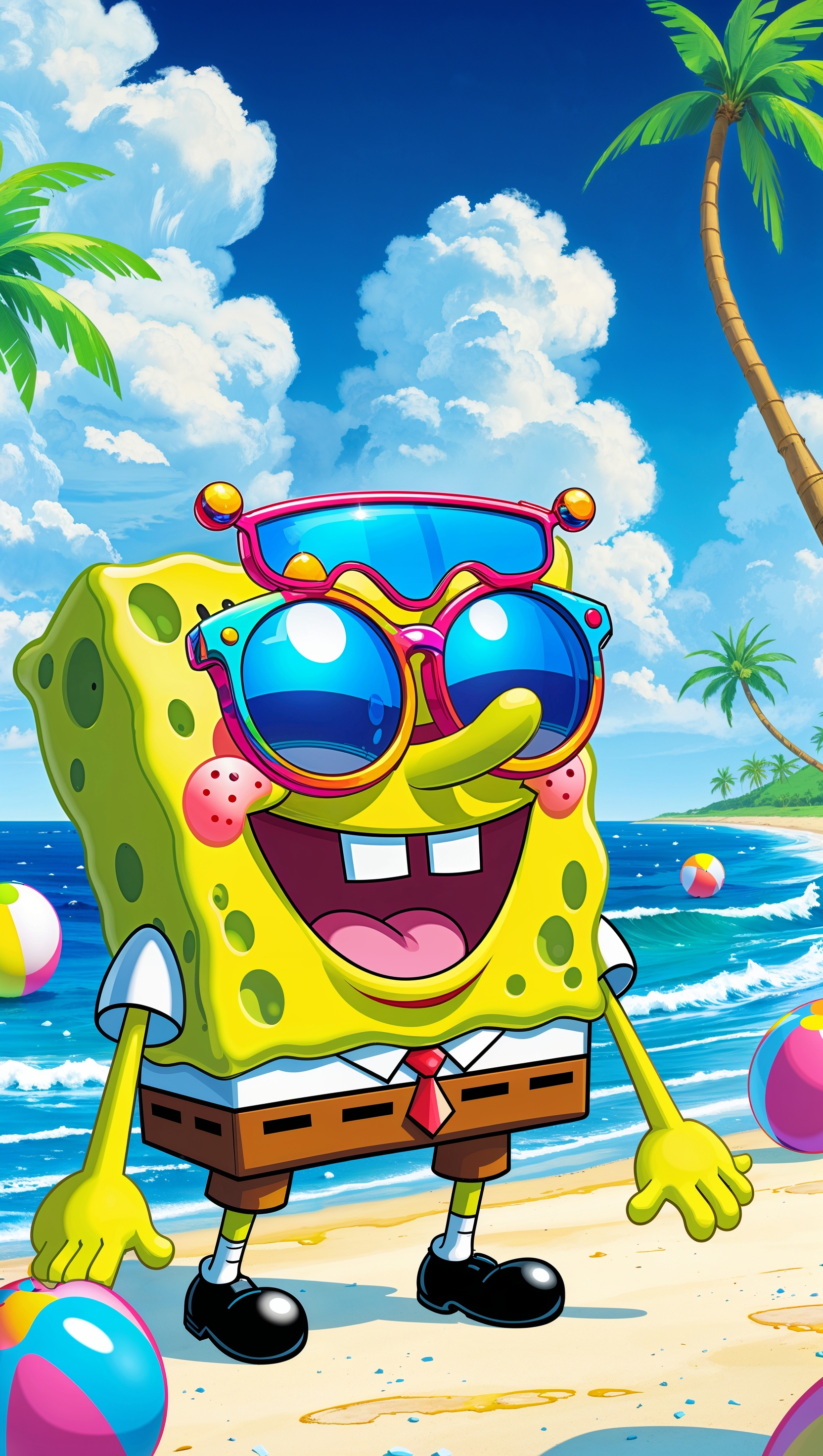 1664x2944 Spongebob wearing sunglasses on the beach for iPhone wallpaper