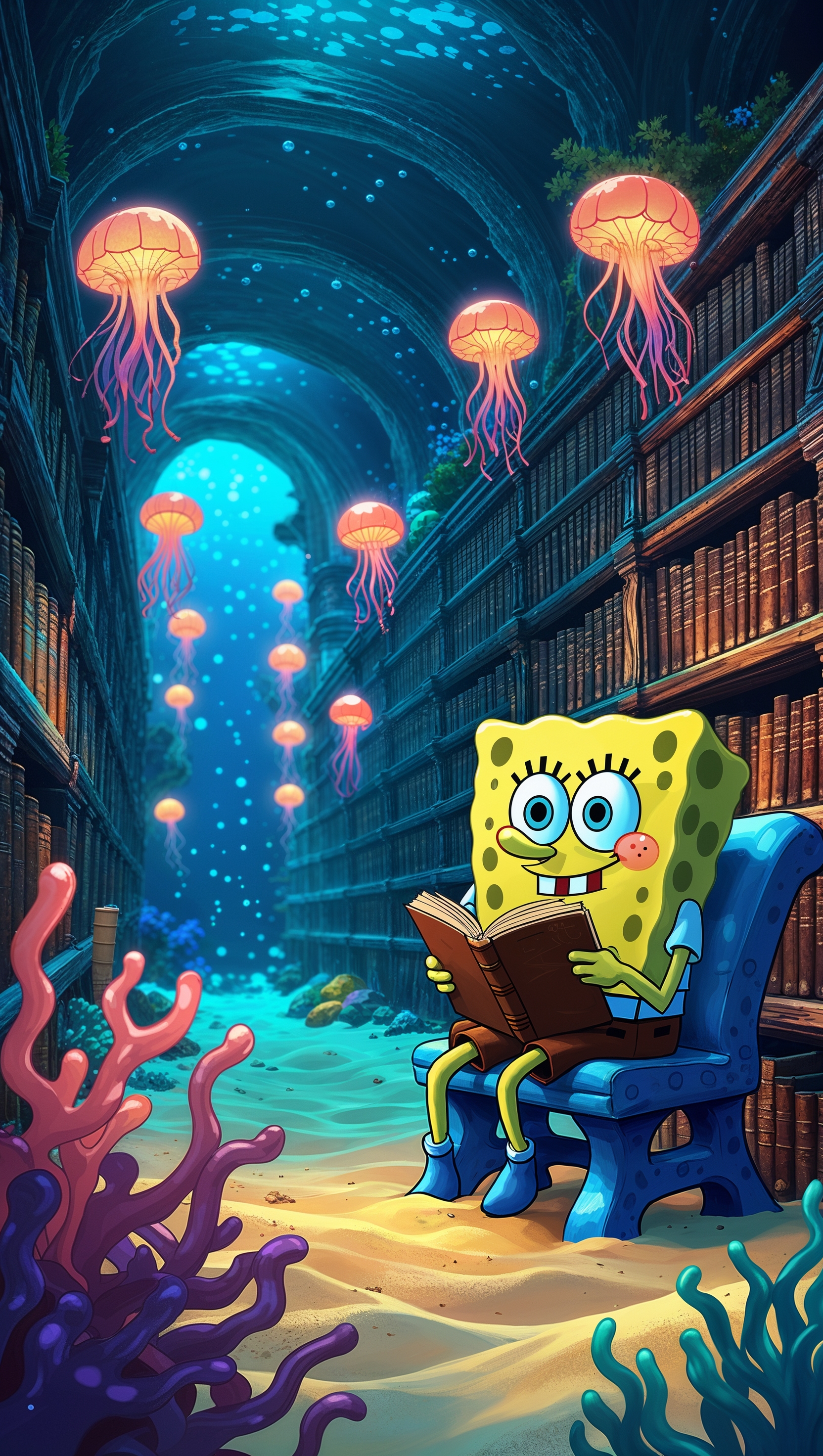 1664x2944 Spongebob reading in an underwater library for iPhone wallpaper