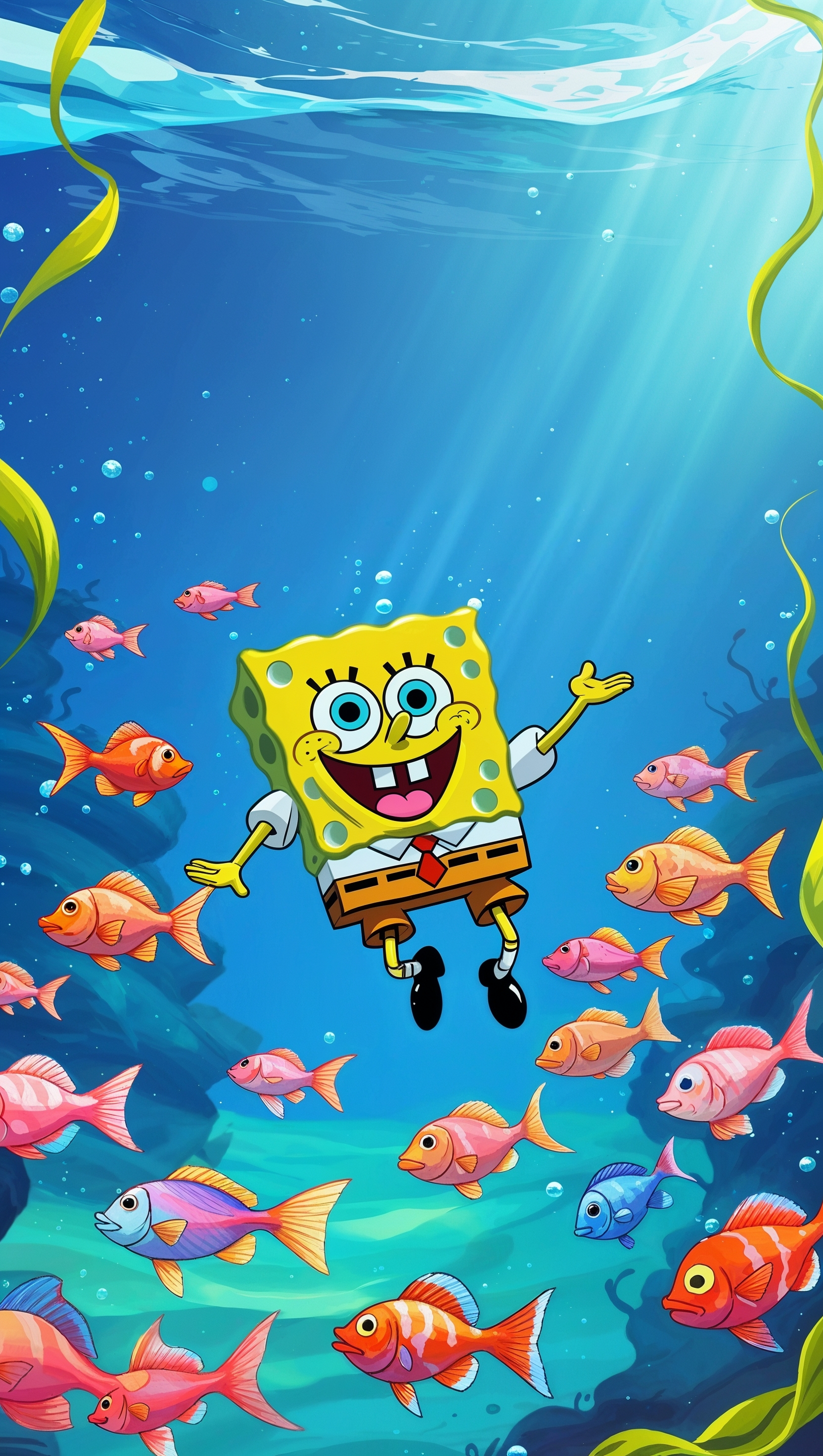 1664x2944 Spongebob swimming with colorful fish for iPhone wallpaper