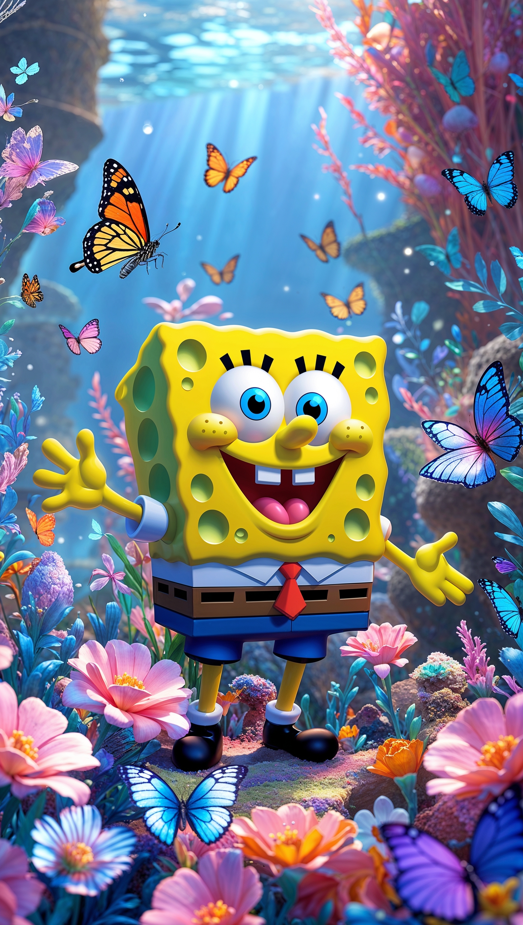 1664x2944 Spongebob in an undersea flower garden with butterflies for iPhone wallpaper