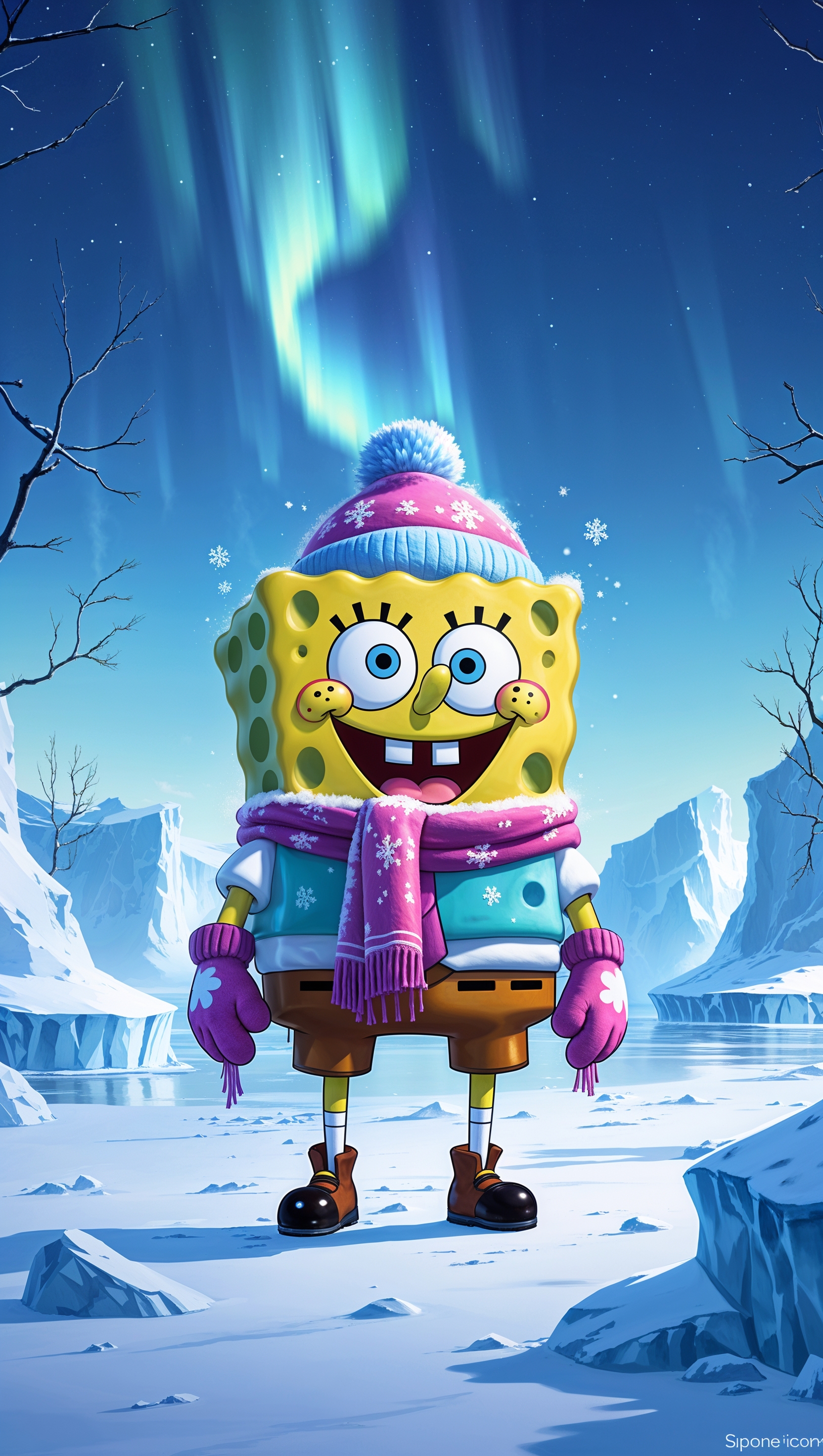 1664x2944 Spongebob in winter clothes in a frozen world for iPhone wallpaper