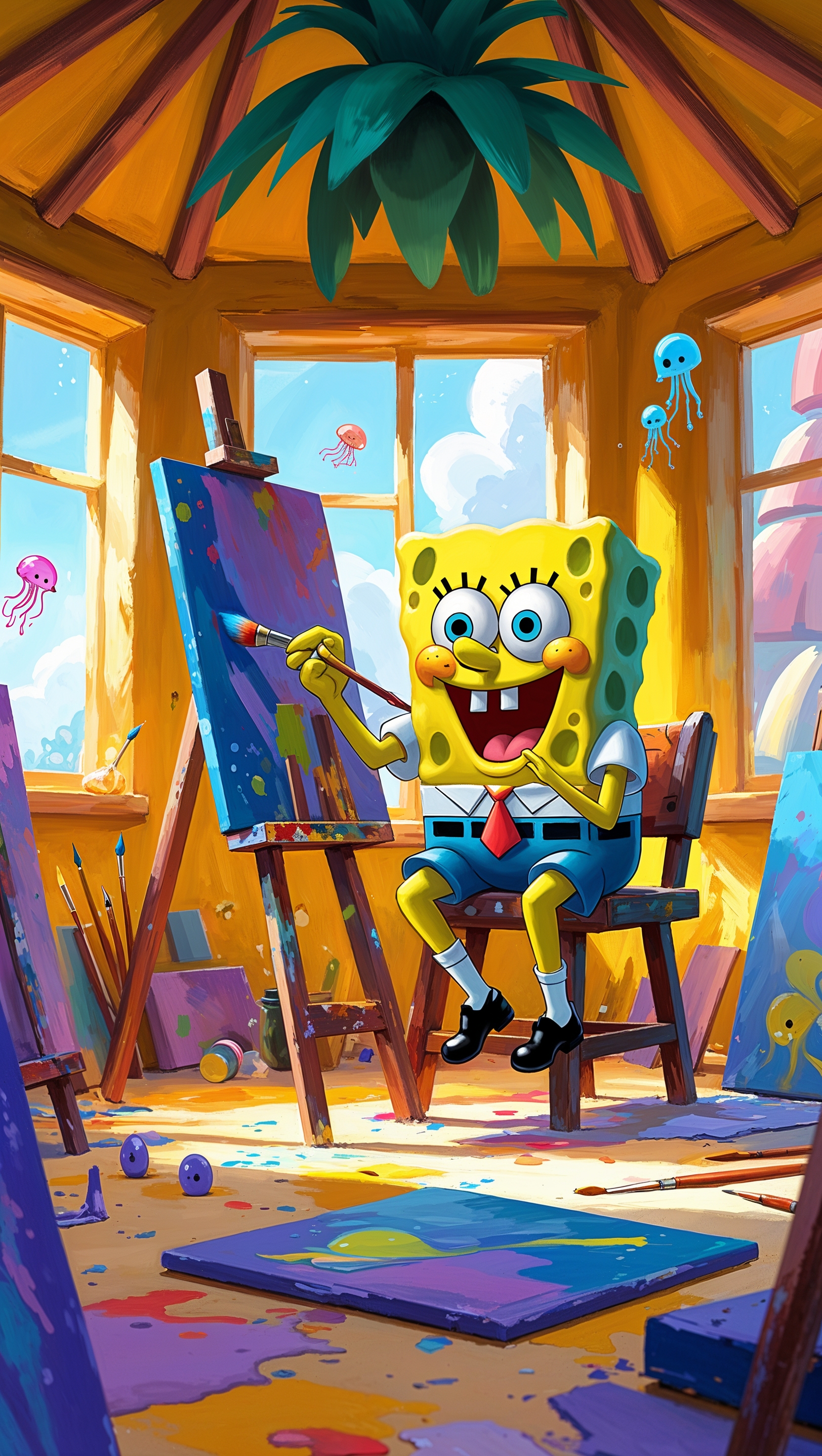1664x2944 Spongebob painting in his pineapple house for iPhone wallpaper