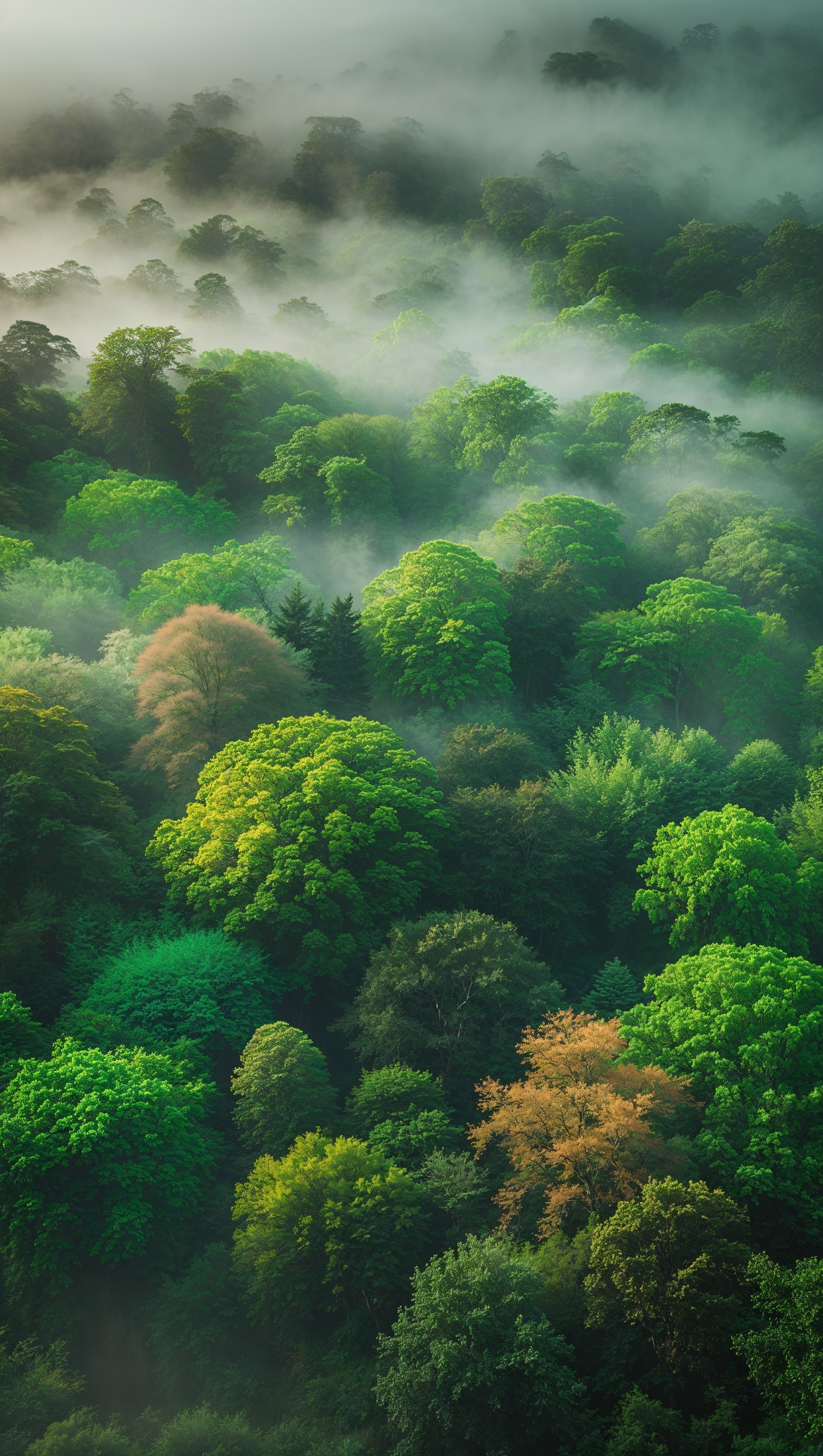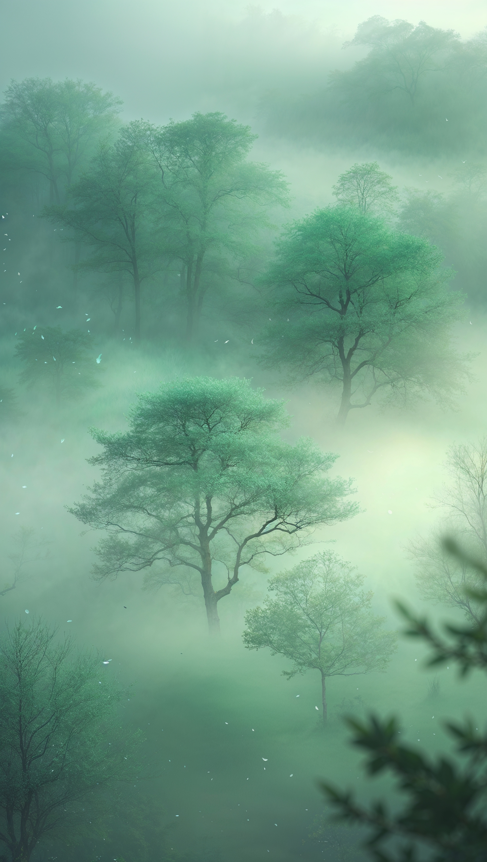 1664x2944 Dreamy green misty landscape with blurred trees and soothing color tones