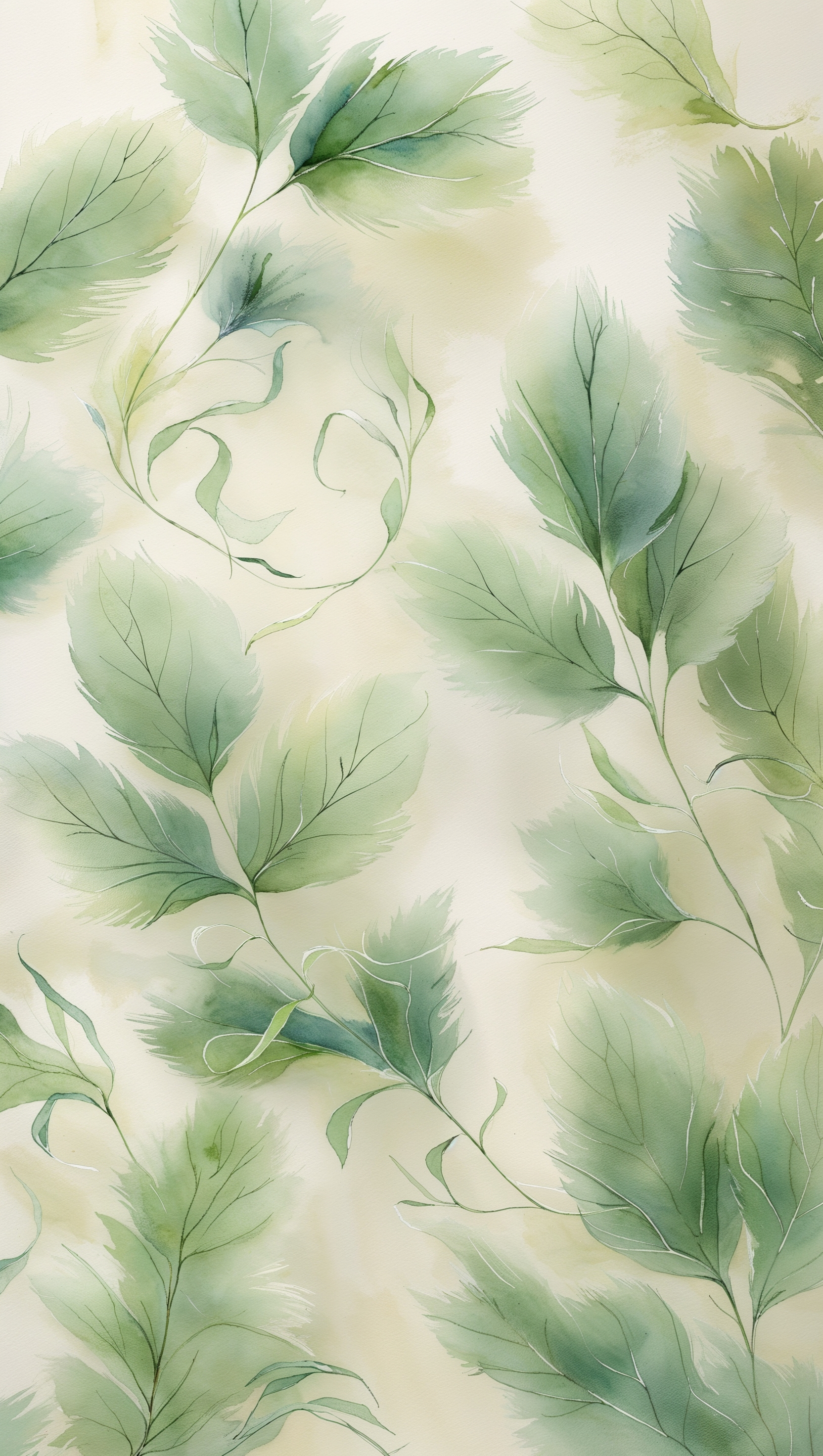 1664x2944 Soft watercolor green leaves scattered on a pale cream background