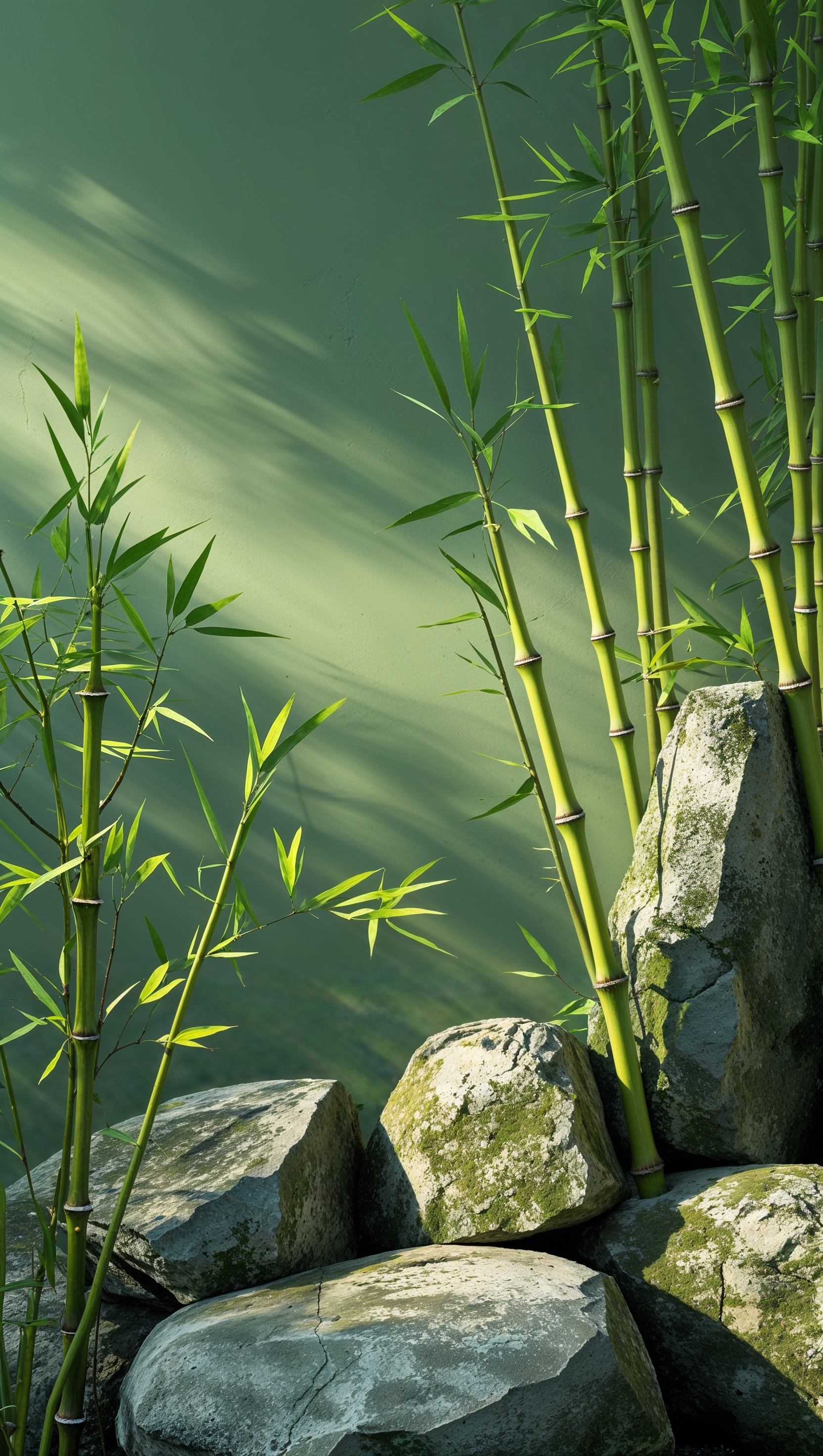 1664x2944 Zen-inspired calm green background with stone and bamboo elements