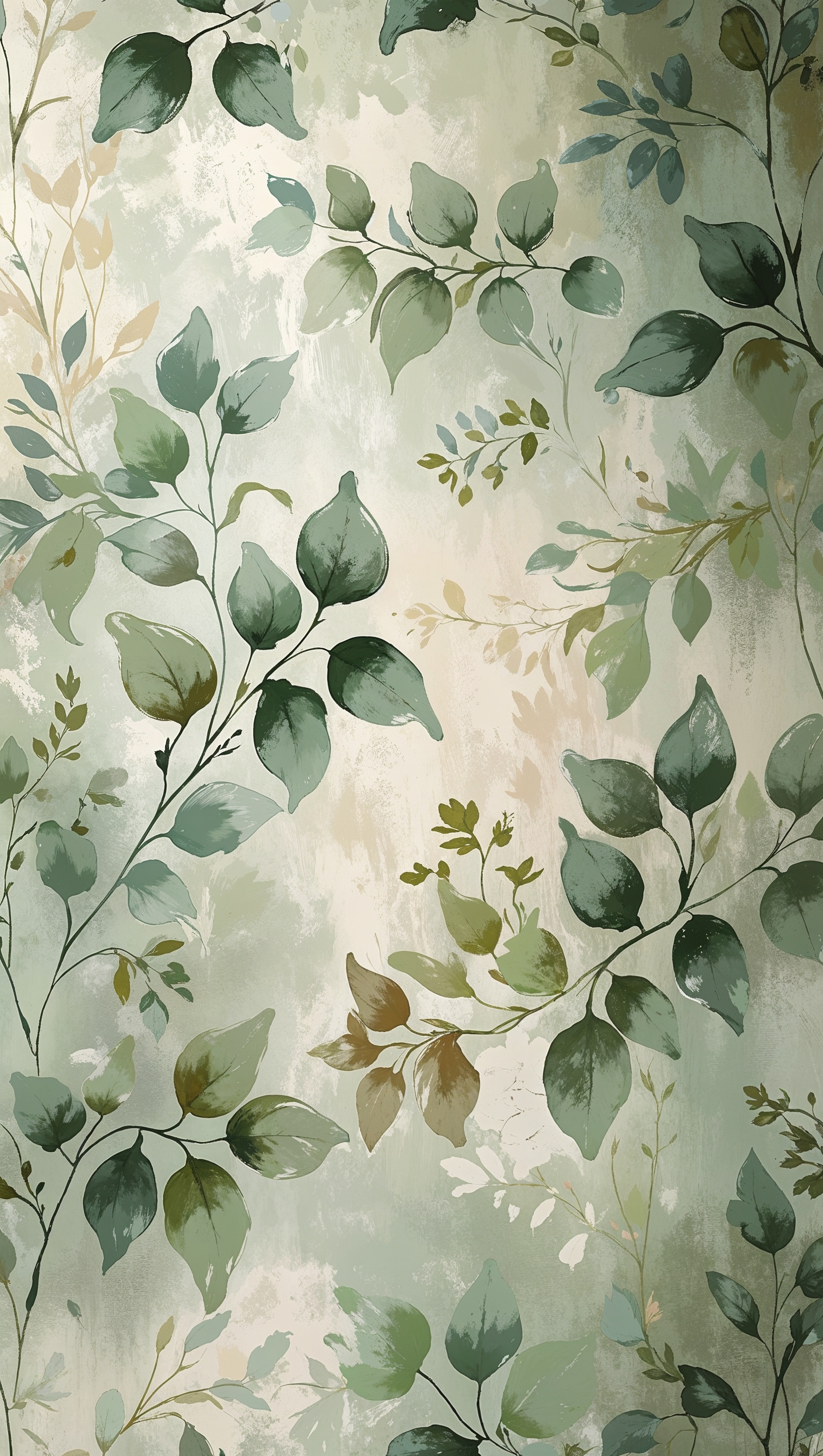 1664x2944 Floral green wallpaper with faded leafy patterns and soft painterly style
