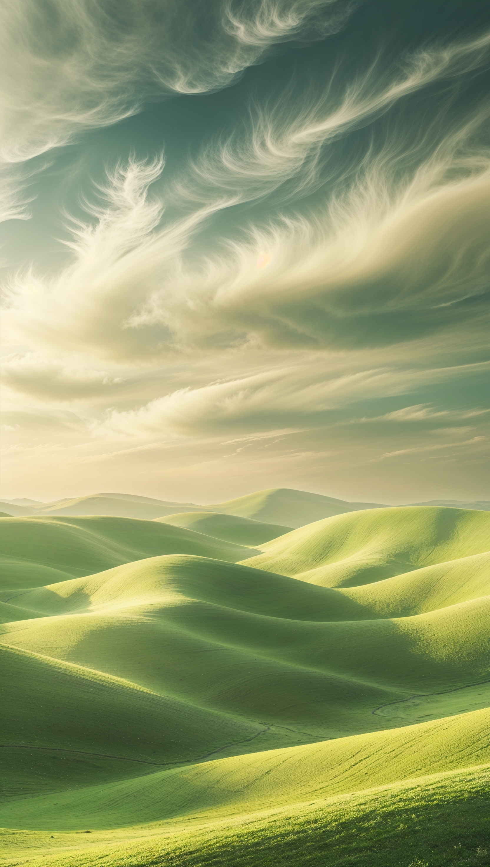 1664x2944 Nature scene with rolling green hills under cloudy skies, soft HDR style