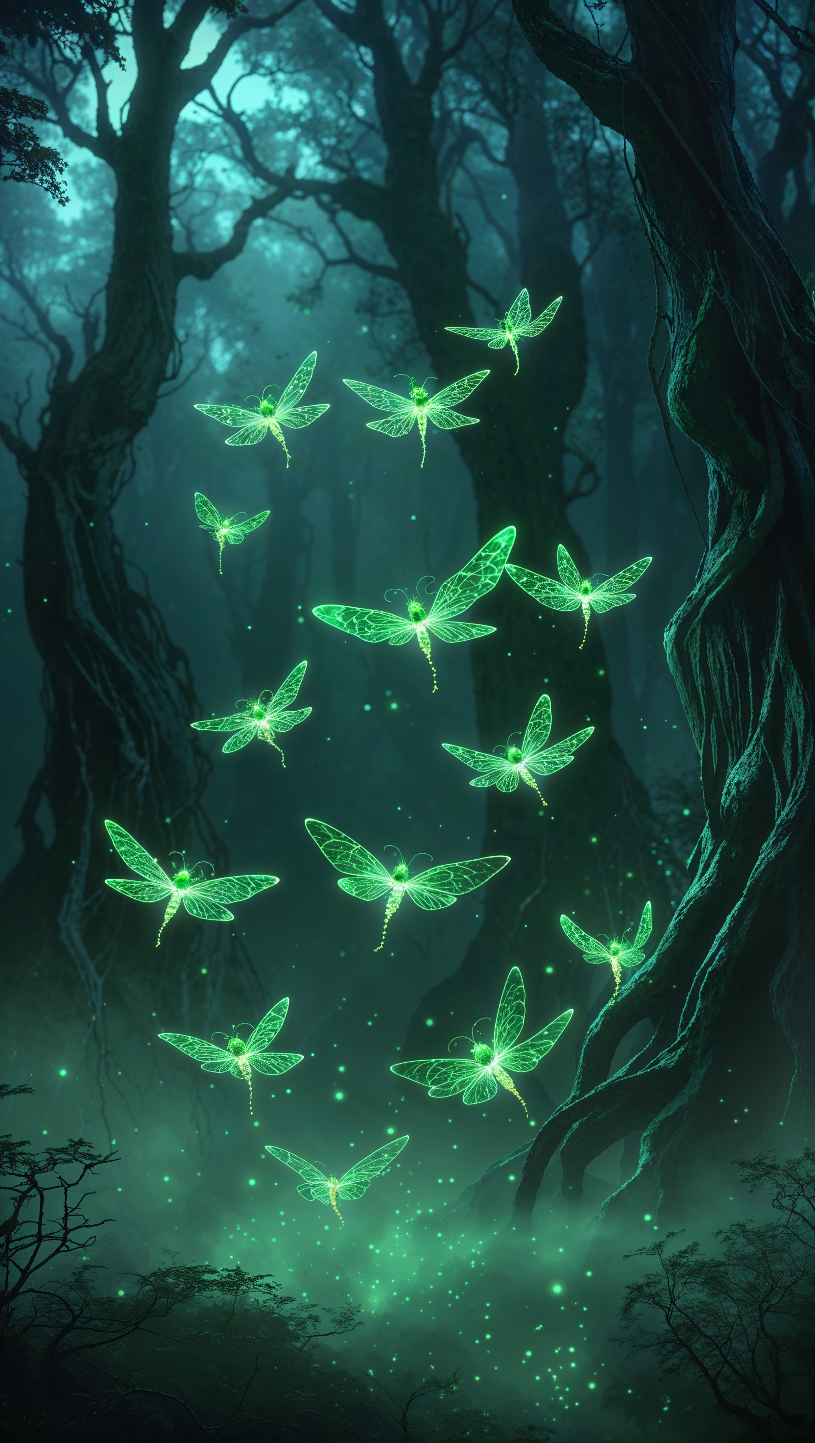 1664x2944 Glowing green fireflies in a dark forest background, magical and serene