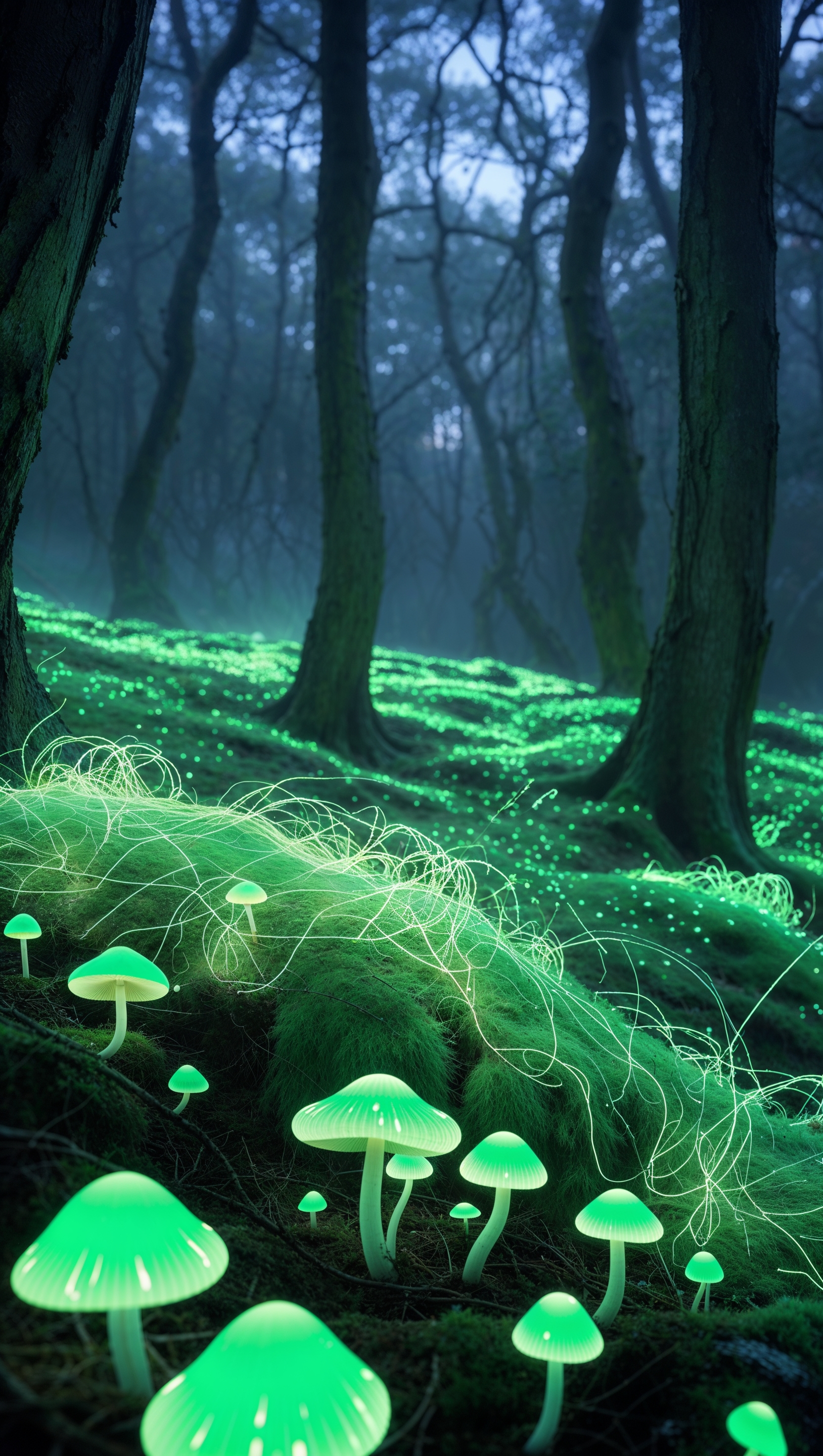 1664x2944 Bioluminescent forest theme with green glowing mushrooms and moss