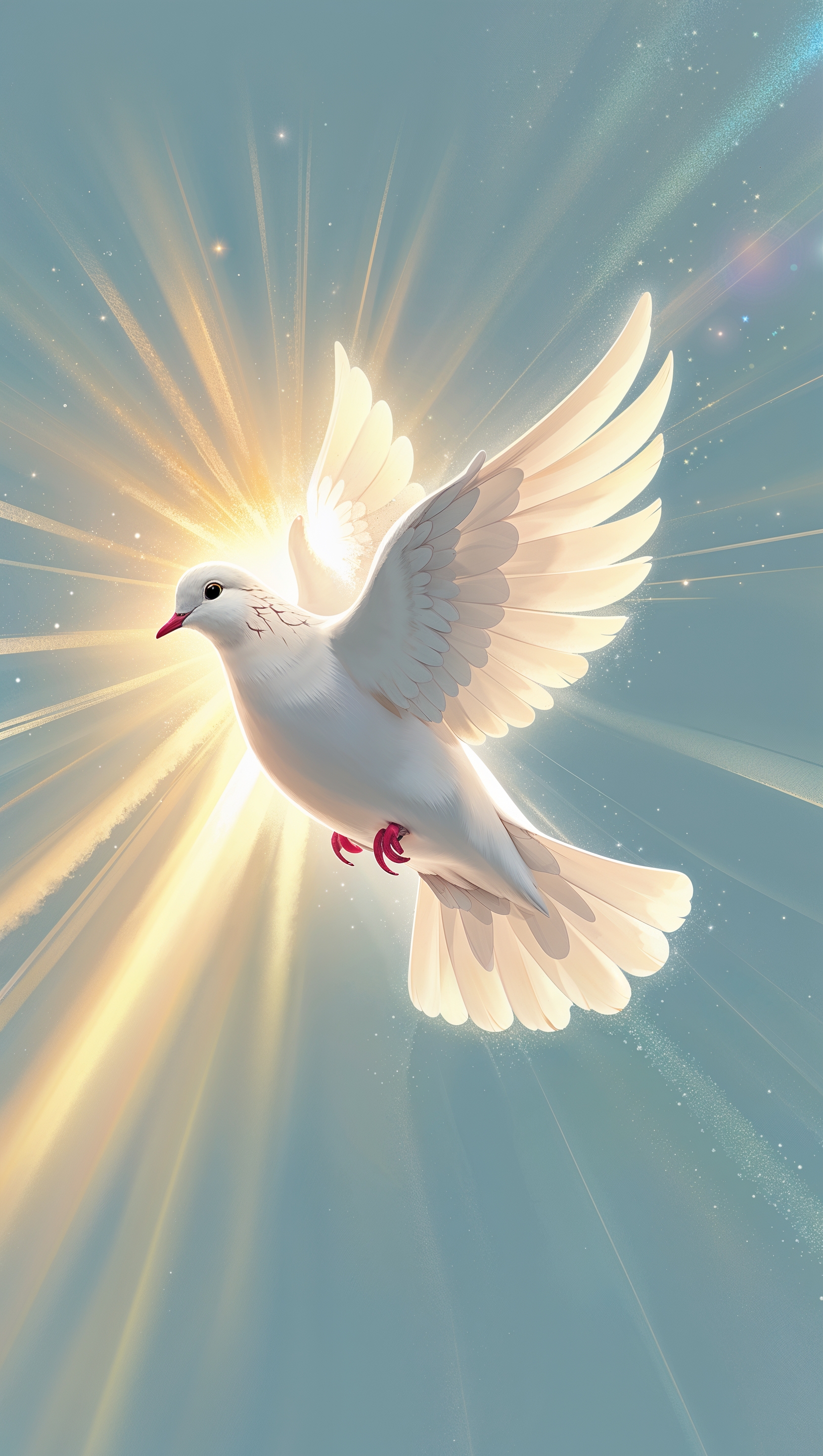 1664x2944 White dove flying through sunlight with glowing rays, symbol of the Holy Spirit