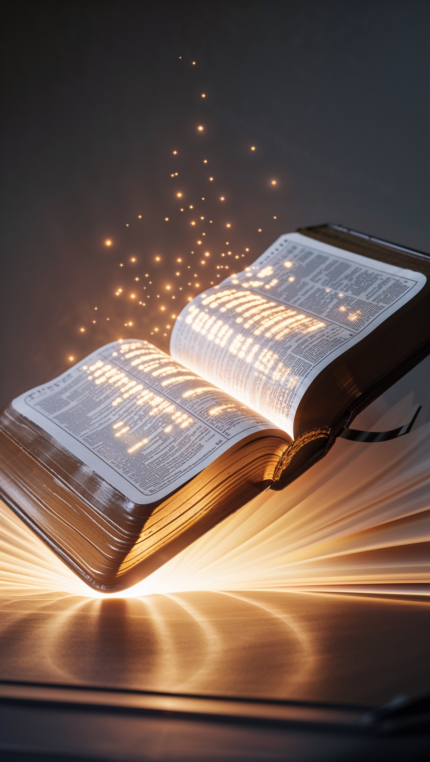 1664x2944 Open Bible with soft glowing light shining from the pages, clean vertical design