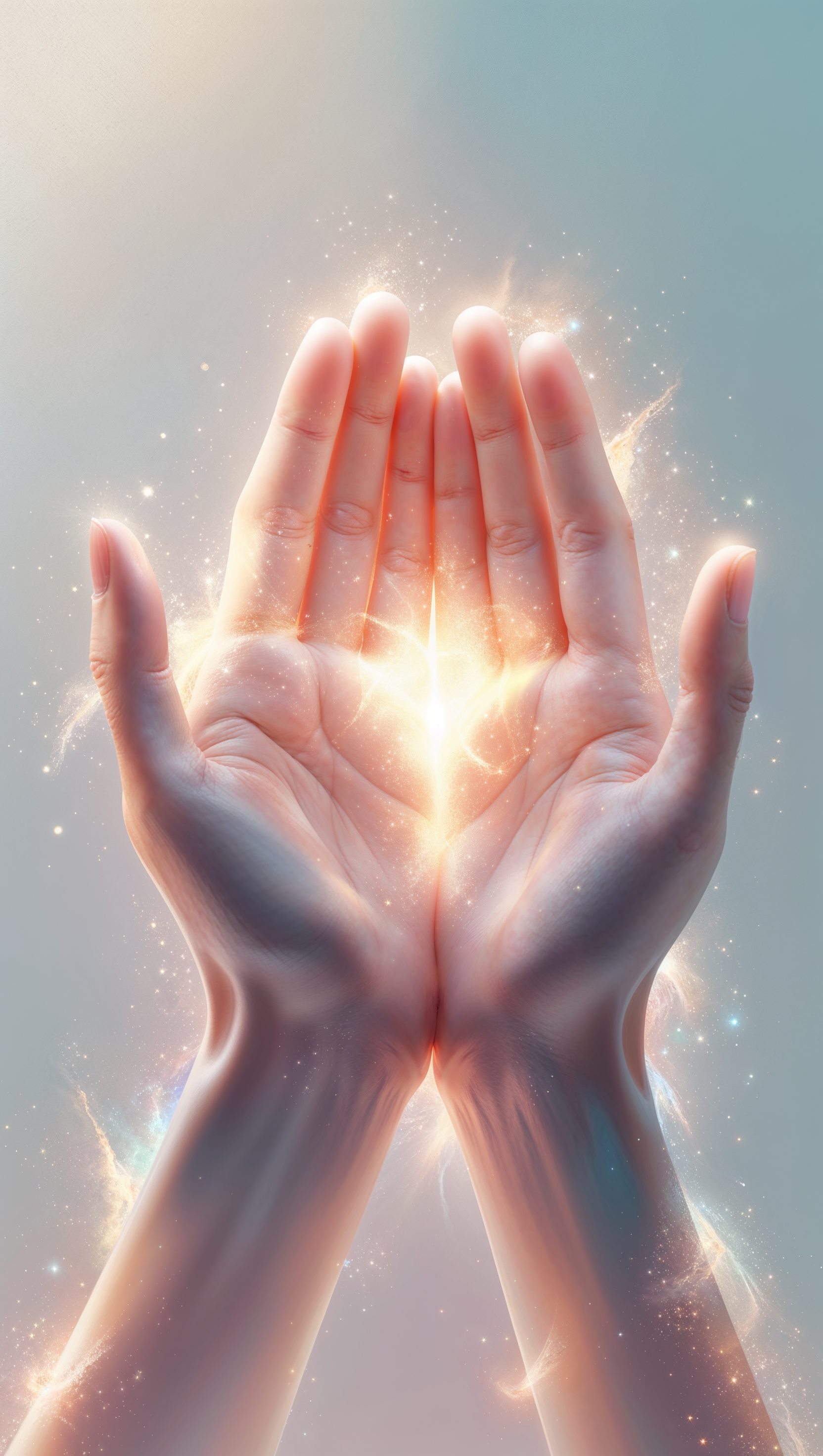 1664x2944 Hands lifted in prayer with glowing heavenly light surrounding them