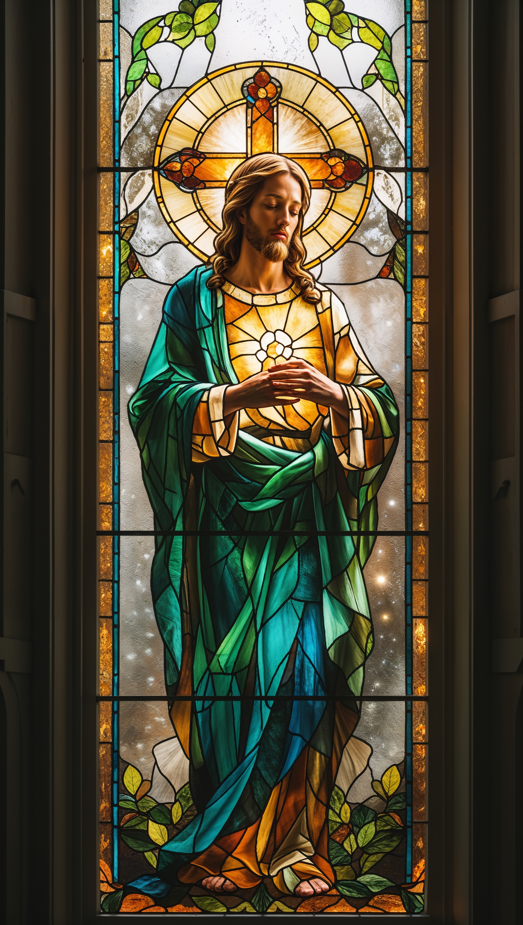 1664x2944 Vertical stained glass window design with Christ figure and soft light