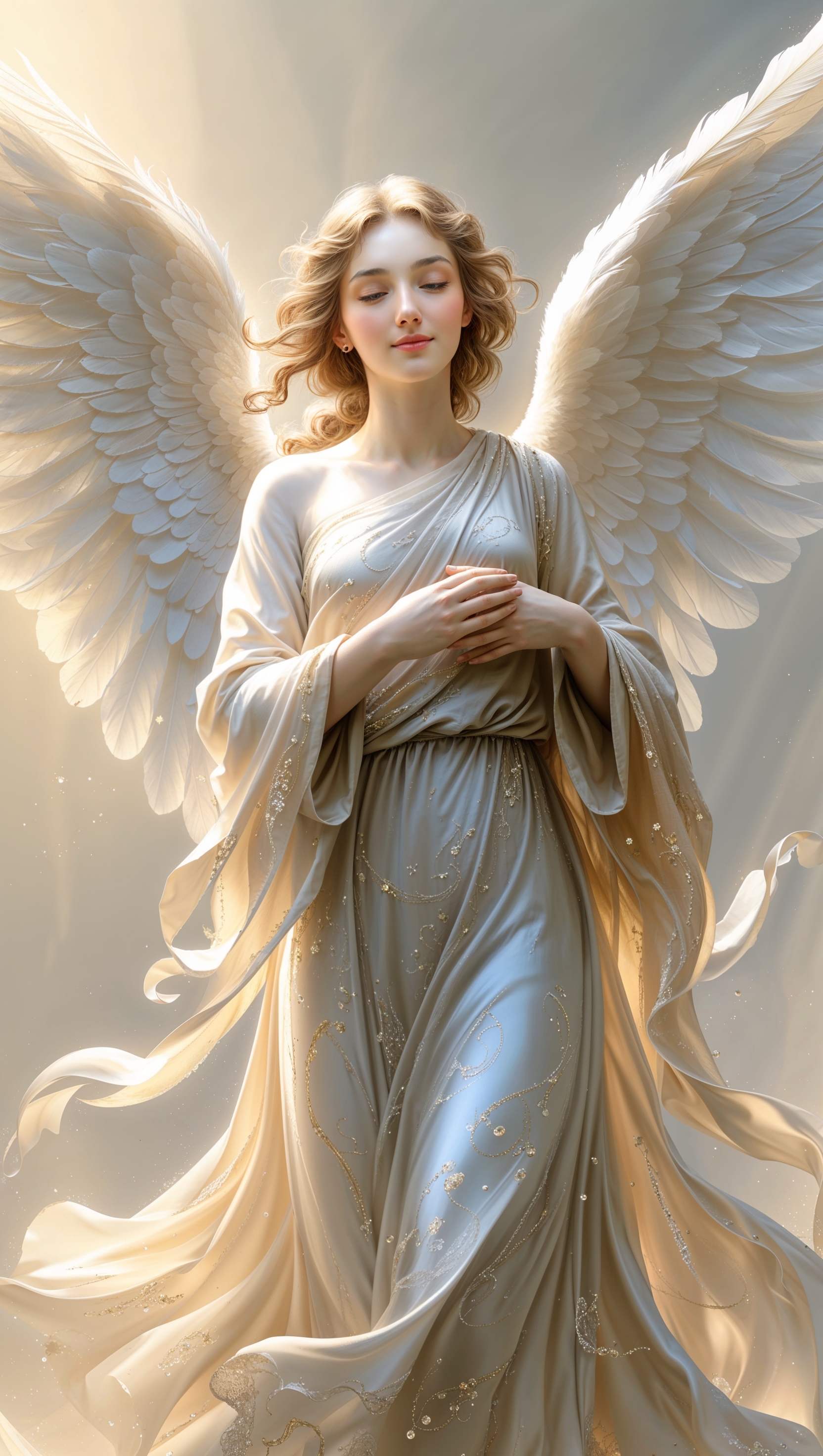 1664x2944 Angel with open wings and flowing robes in glowing light, peaceful expression