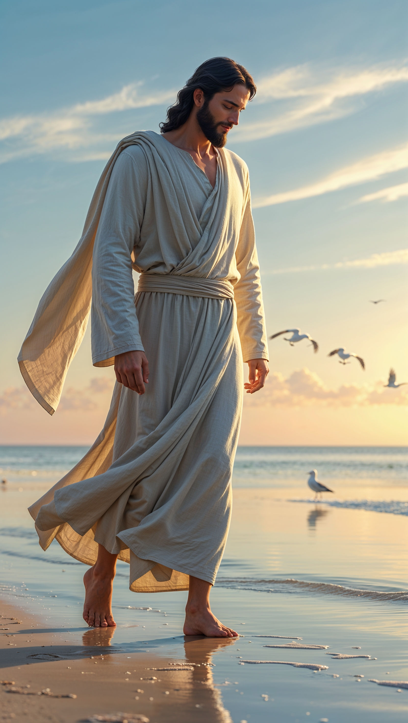 1664x2944 Jesus walking along the shoreline with light reflecting off water, calm and reflective