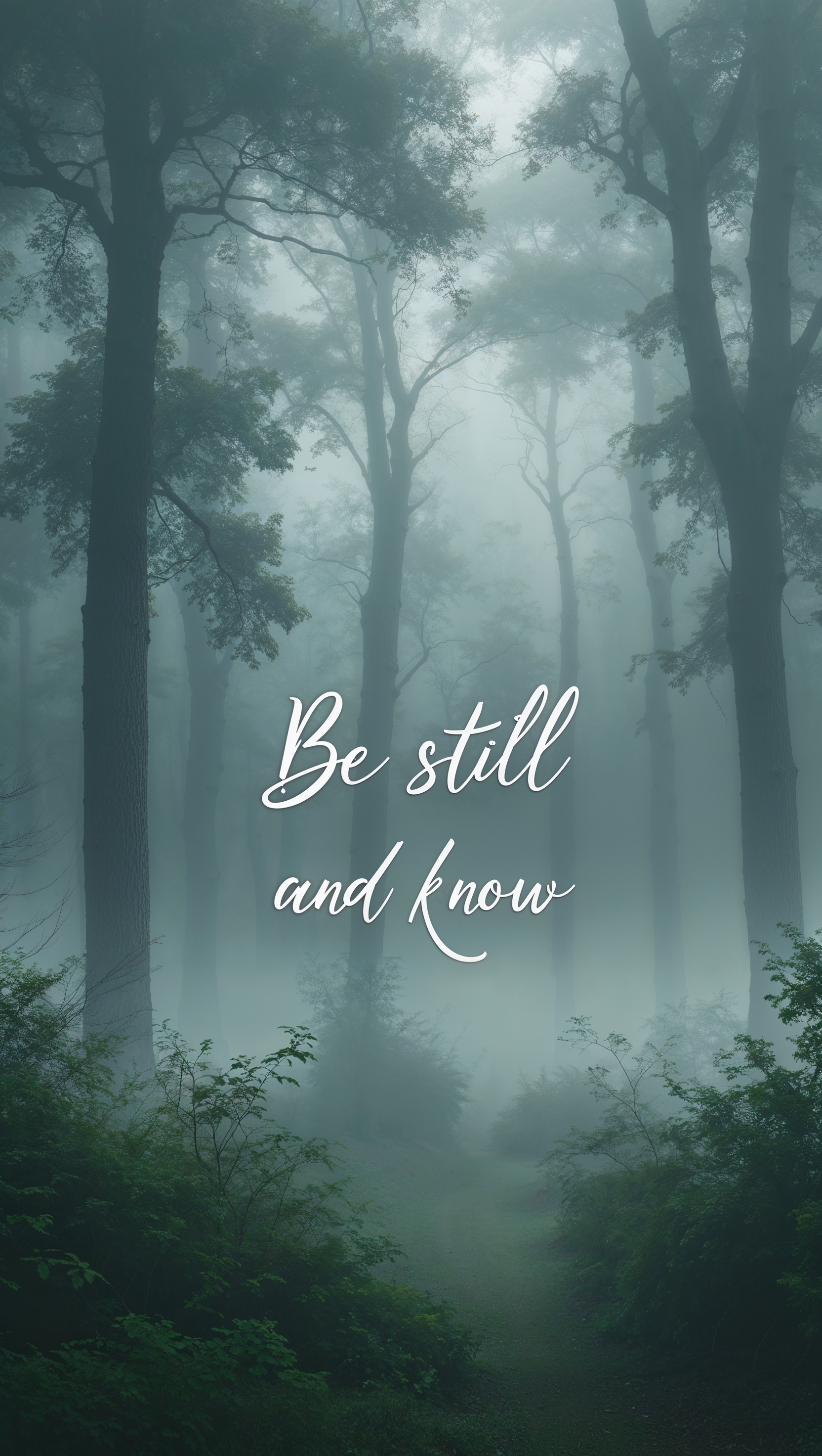 1664x2944 “Be Still and Know” verse over peaceful nature scene with fog and trees