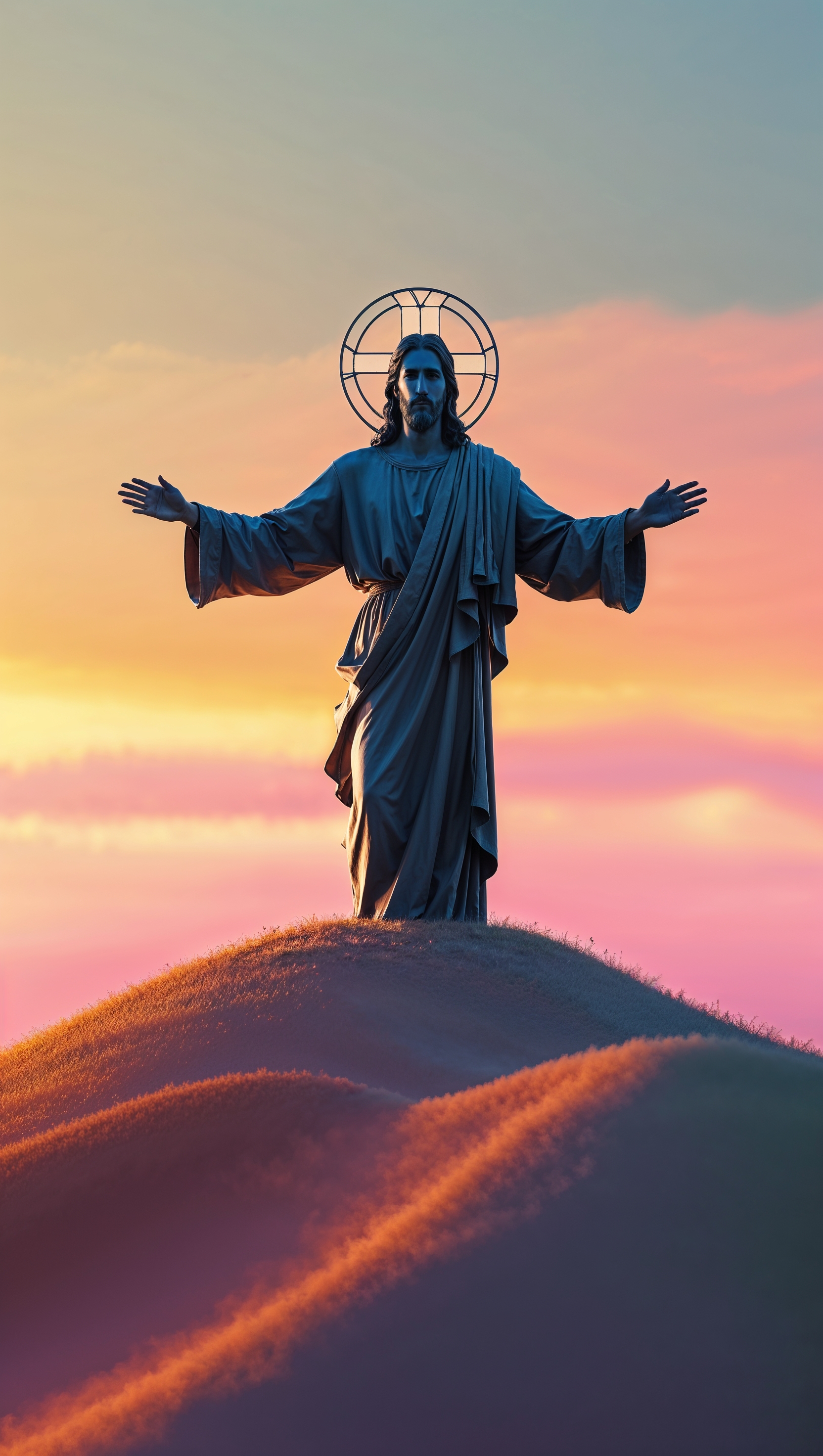 1664x2944 Silhouette of Jesus with outstretched arms on a hill, golden horizon background
