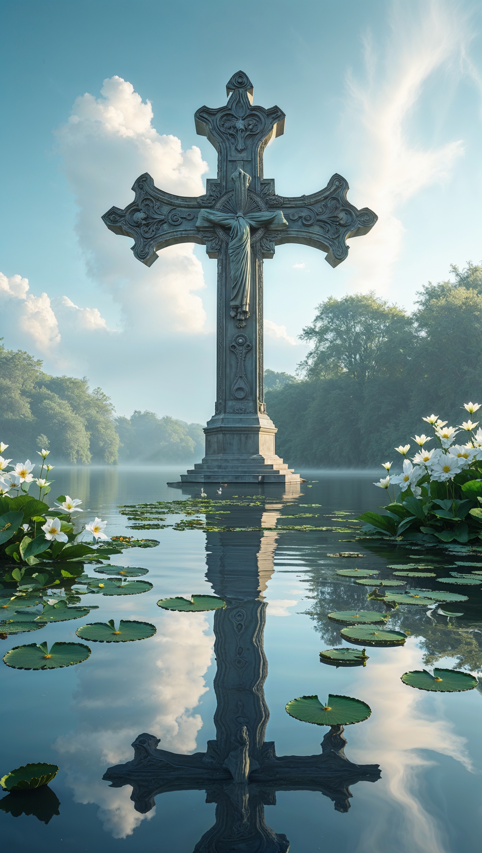 1664x2944 Calm water with reflection of a cross, serene and peaceful tones