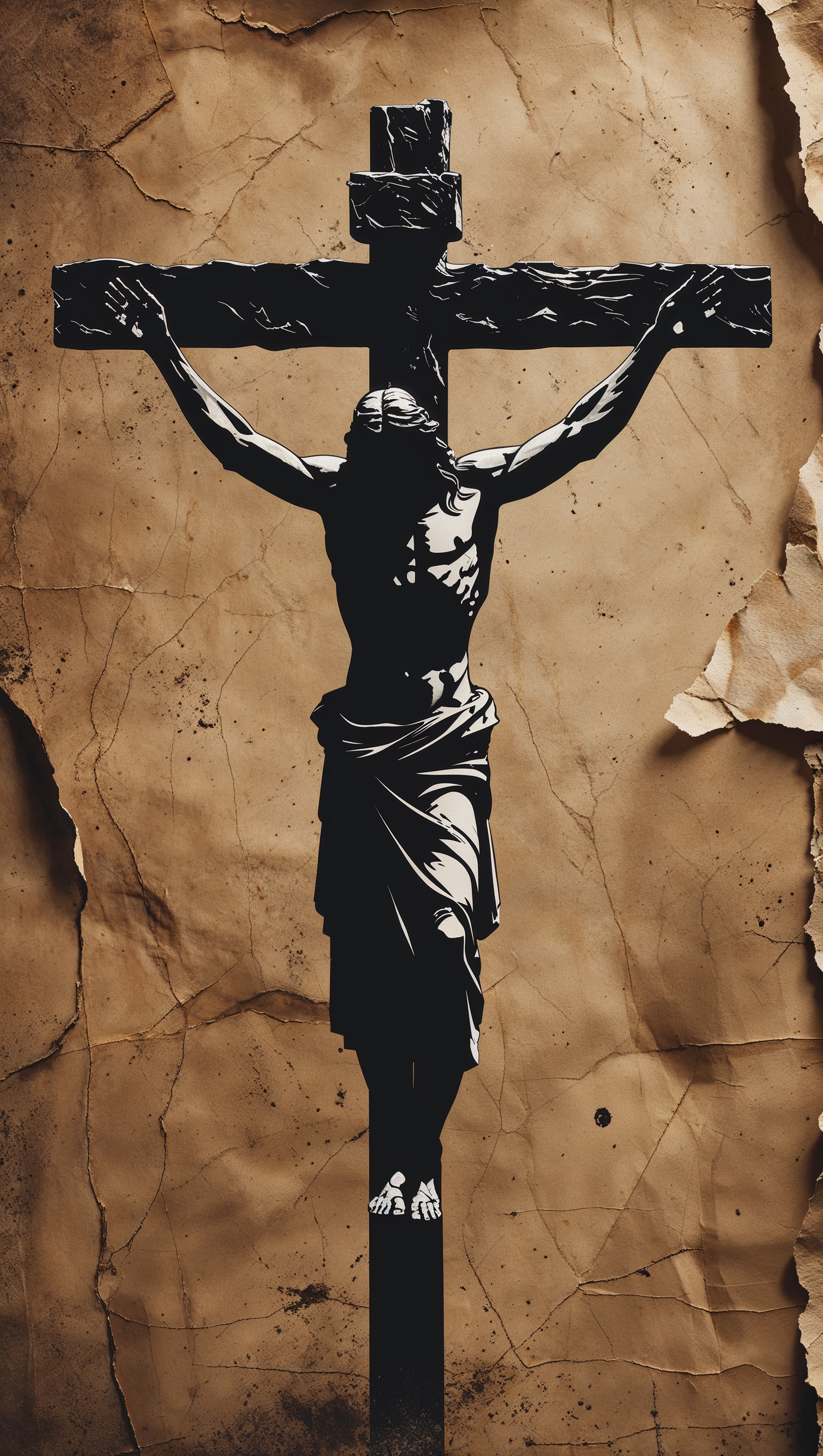 1664x2944 Jesus carrying the cross, minimalist silhouette style over parchment texture