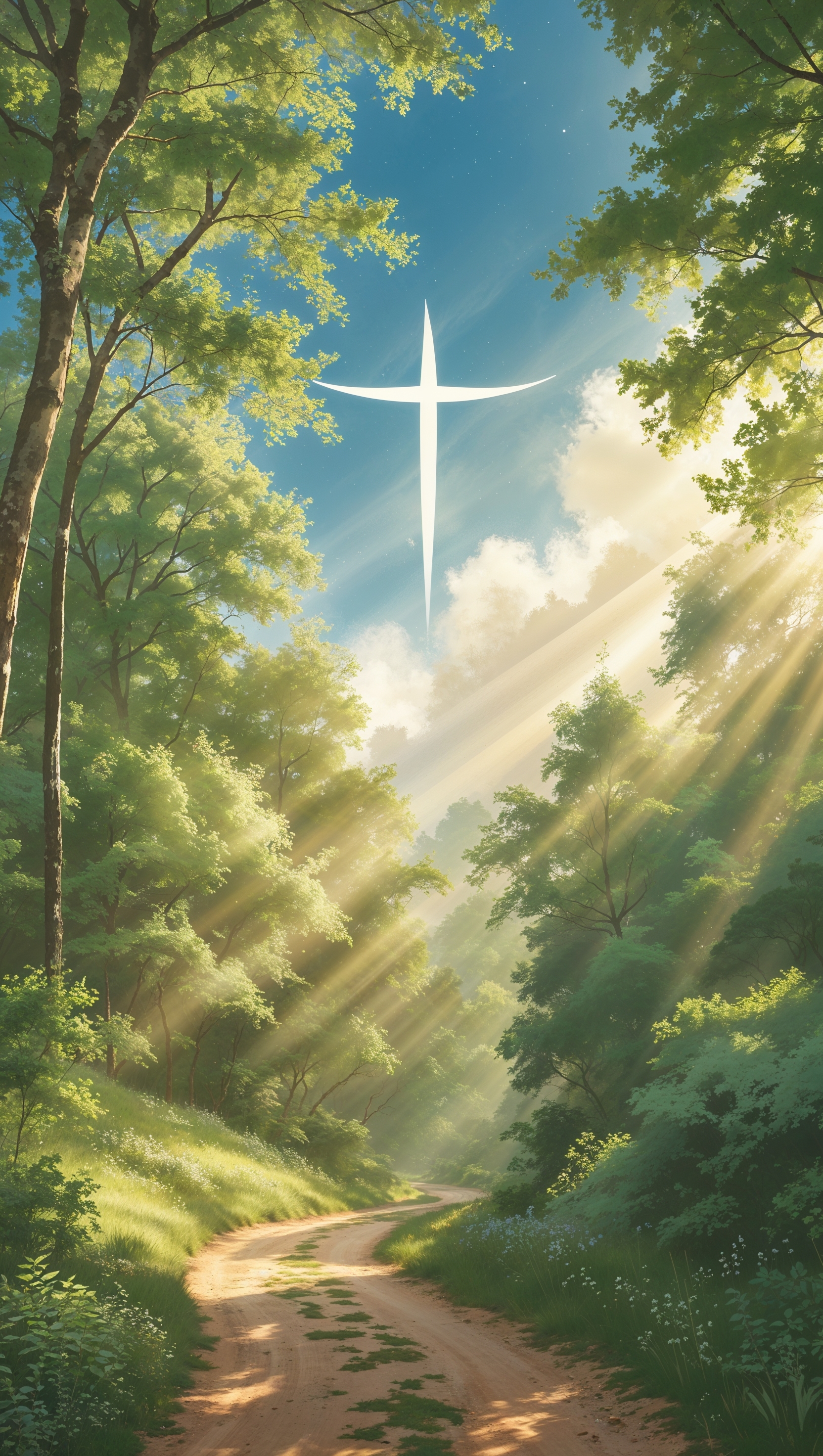 1664x2944 Peaceful nature trail with light rays and subtle cross symbol in the sky