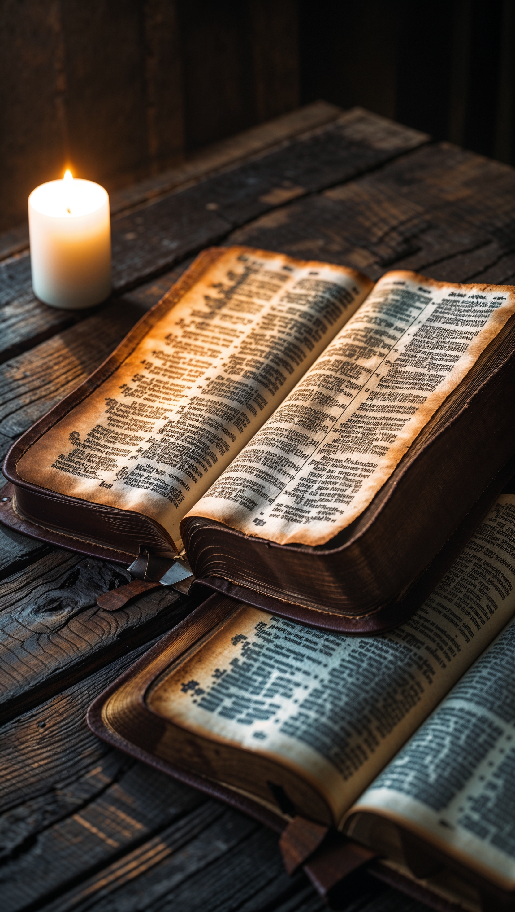 1664x2944 Holy Bible laying on a wooden table with soft candlelight glow