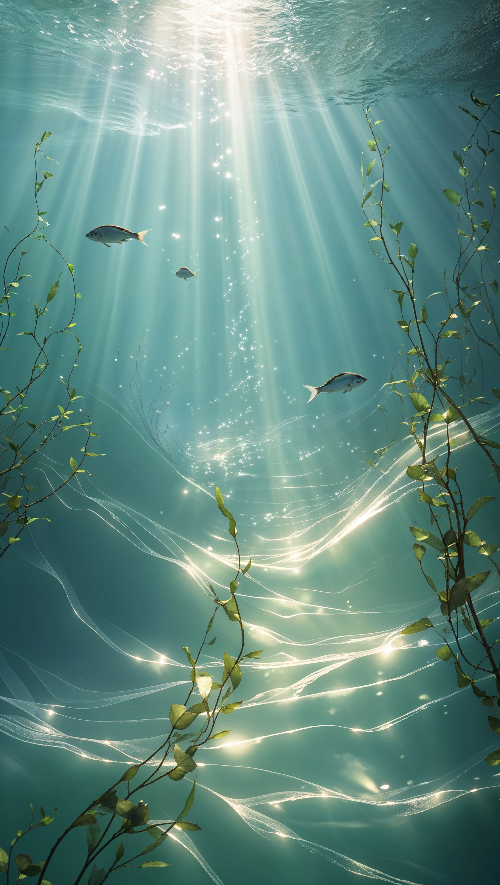 1664x2944 Underwater scene with rays of light shining through the surface, serene and magical