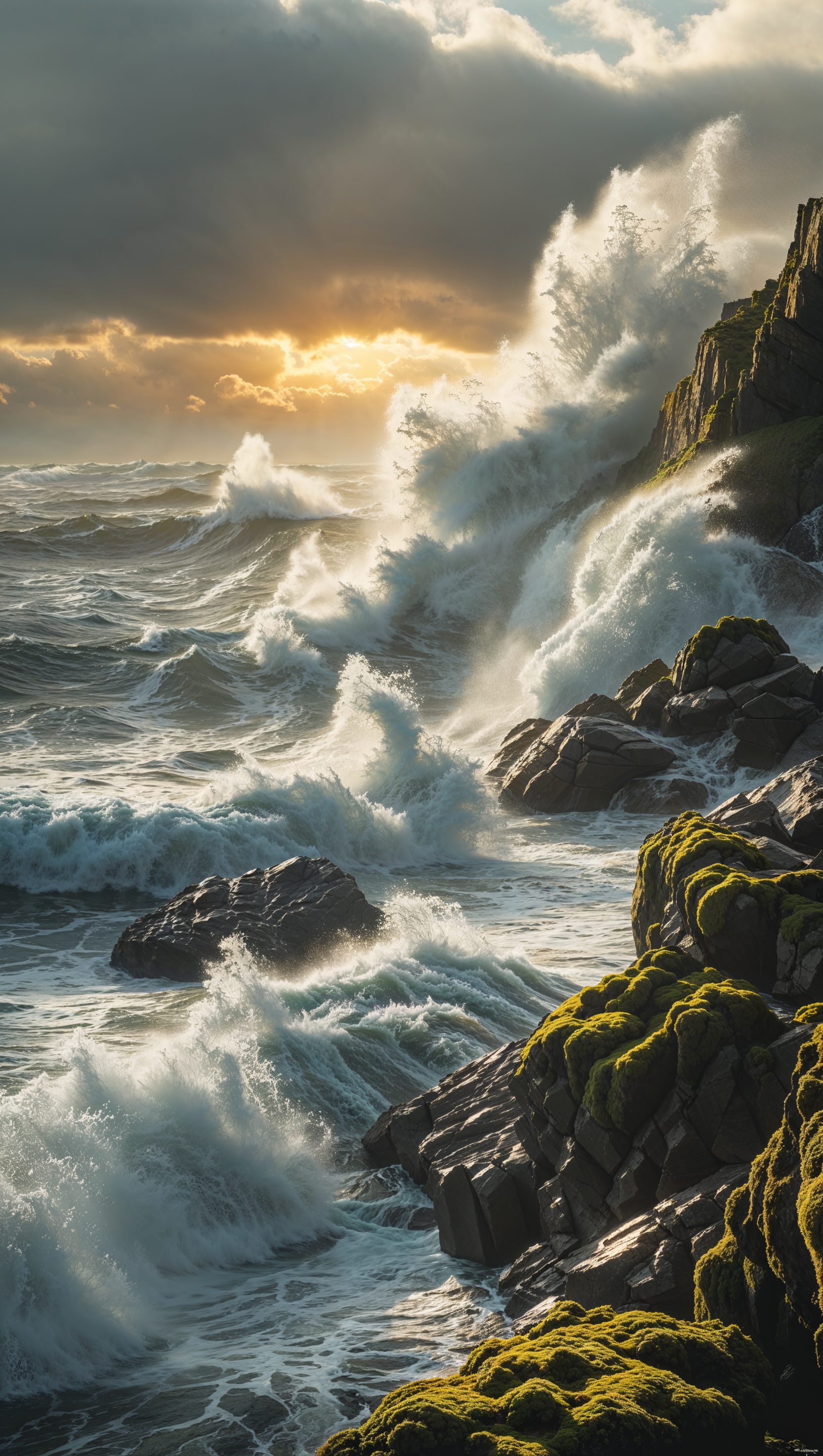 1664x2944 Waves crashing dramatically on rocks, cinematic and dynamic scene