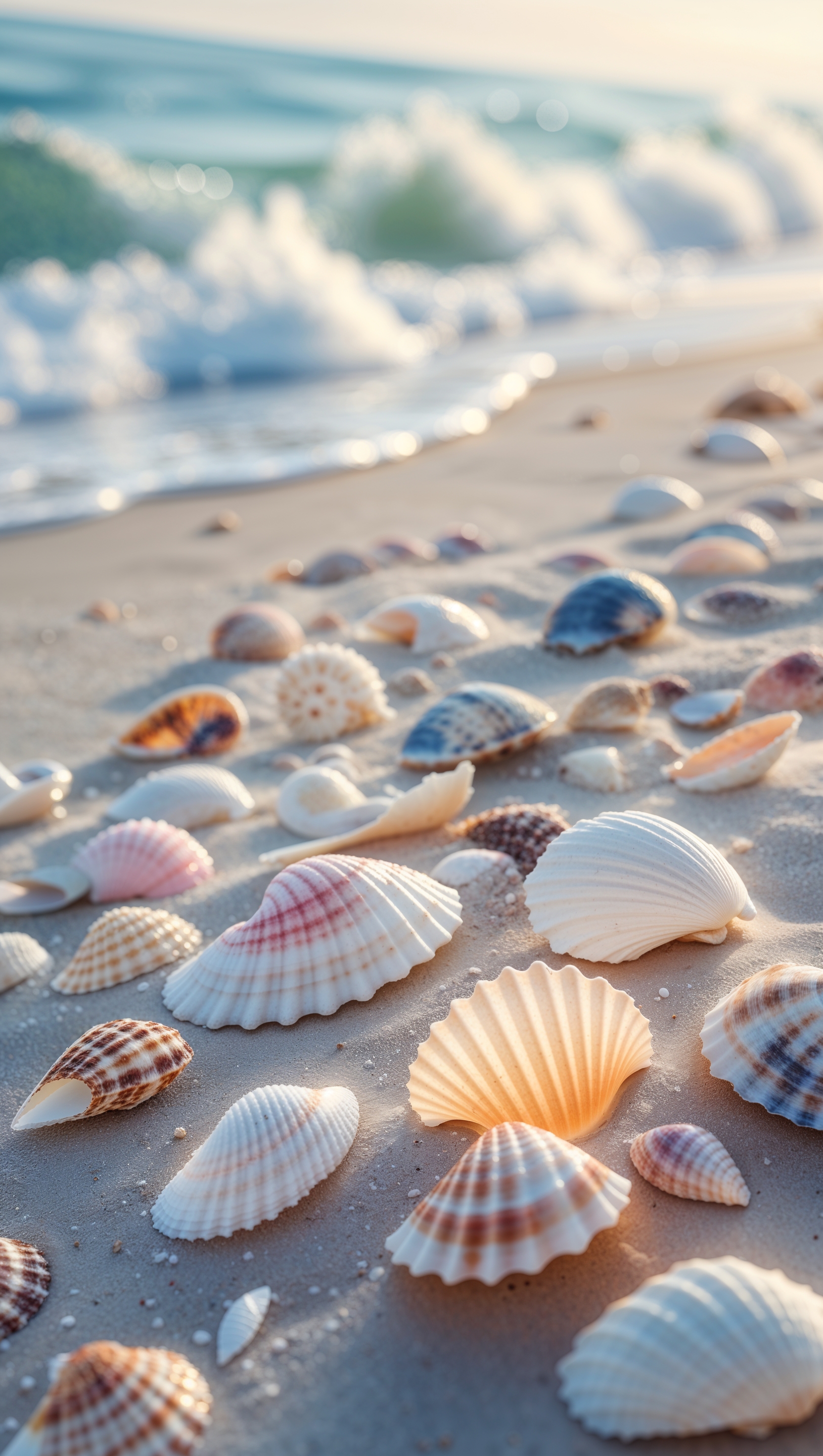1664x2944 Soft-focus image of seashells on a beach with ocean waves in the background