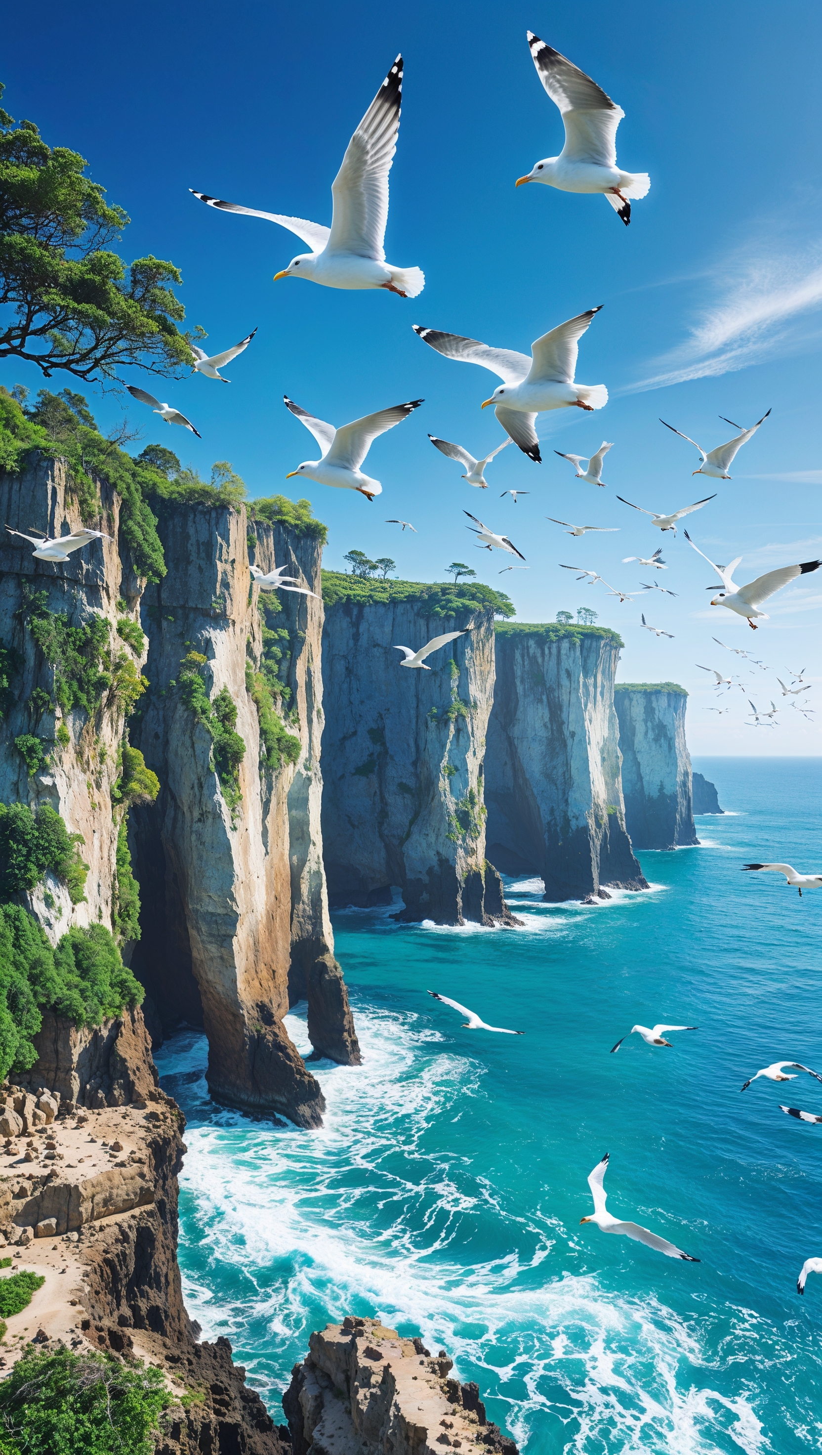 1664x2944 Vertical wallpaper of ocean and cliffs with birds flying above, natural and free