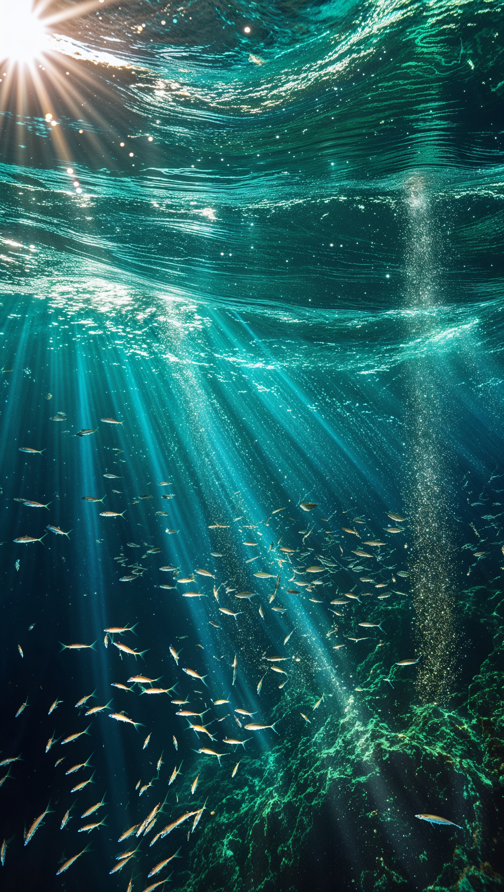1664x2944 Sunlight piercing through ocean surface in underwater view, glowing particles