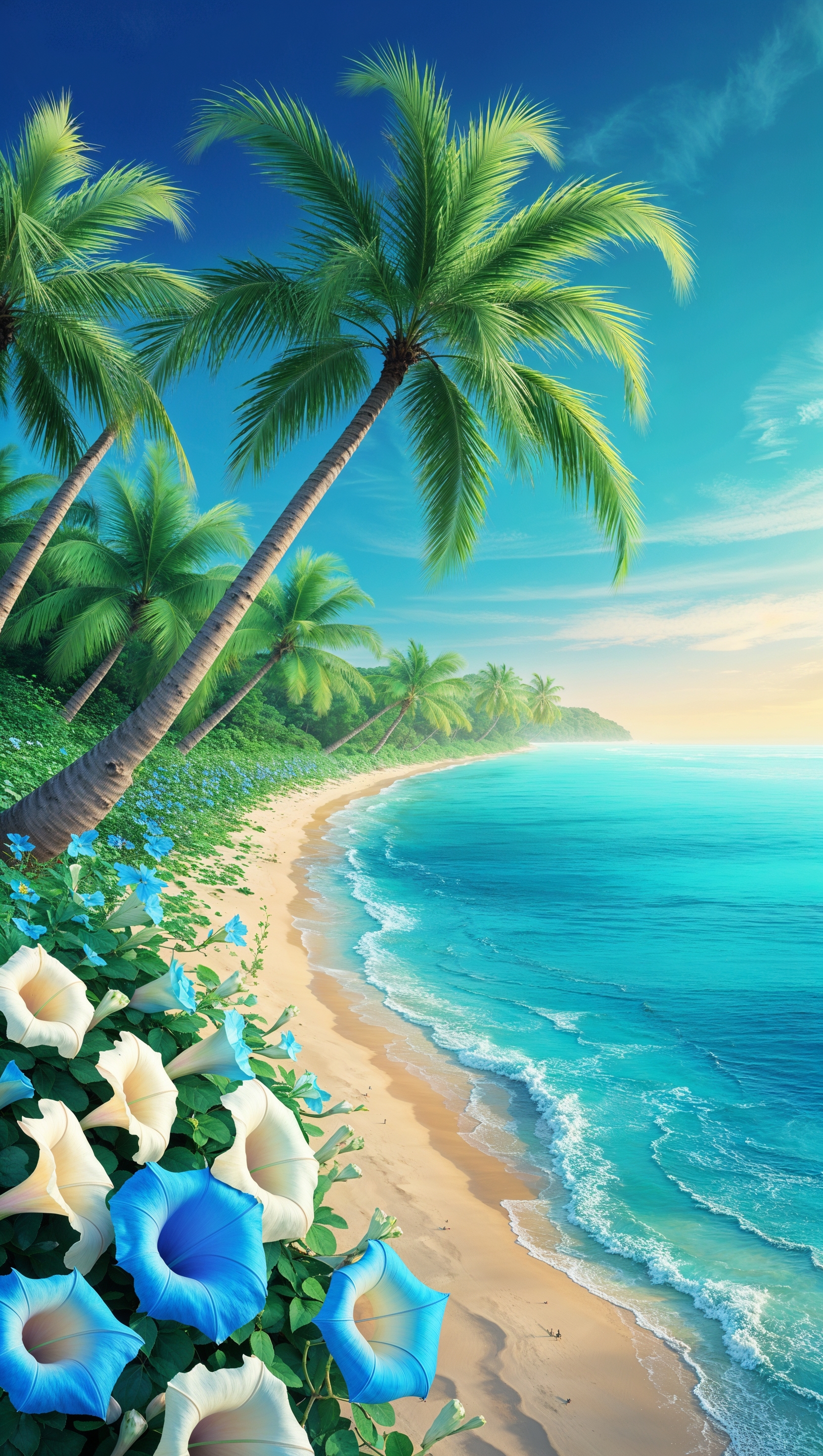 1664x2944 Tropical ocean scene with palm trees on shoreline and vibrant blue water