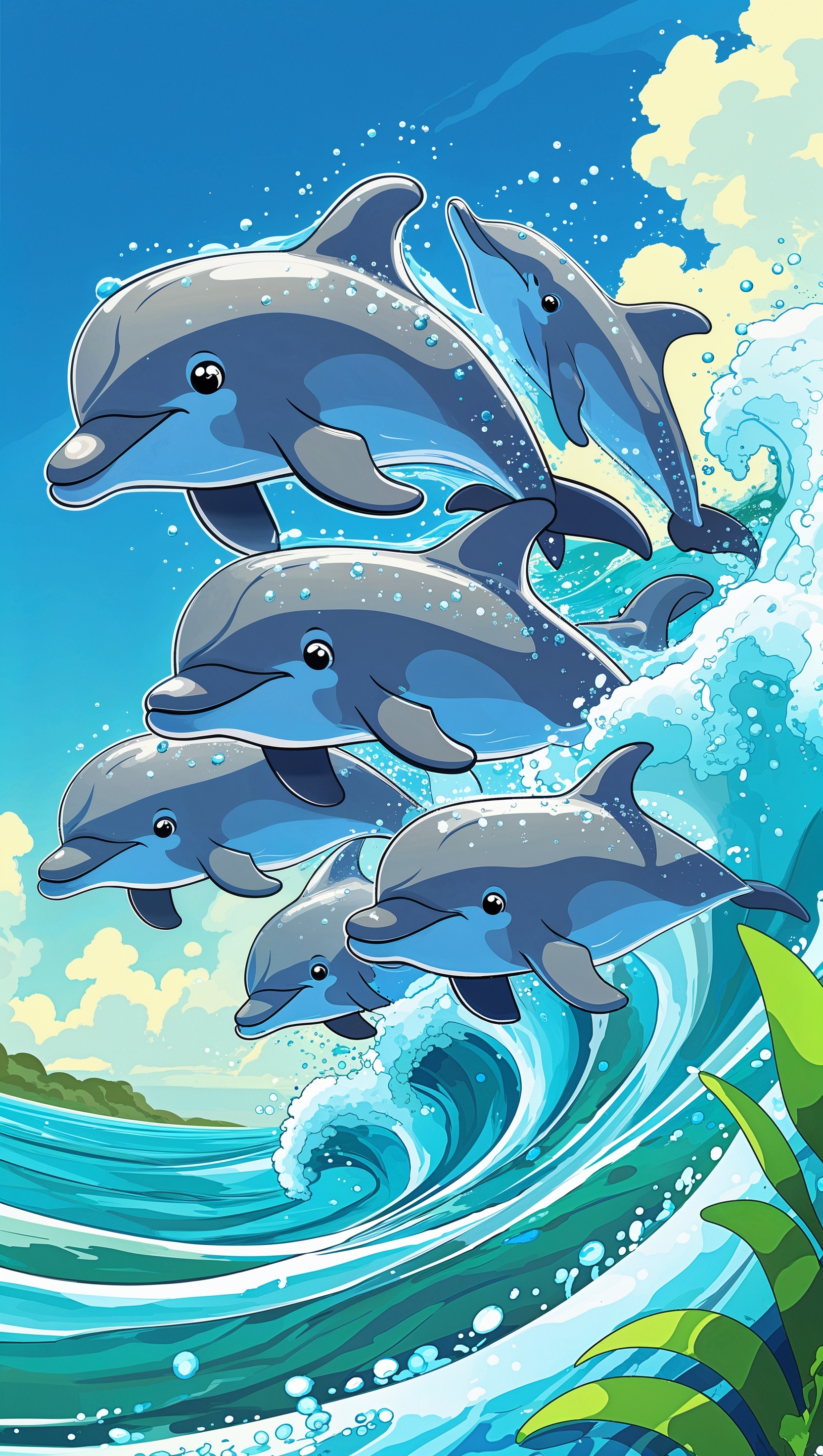 1664x2944 Cute cartoon-style ocean wallpaper with dolphins jumping from waves
