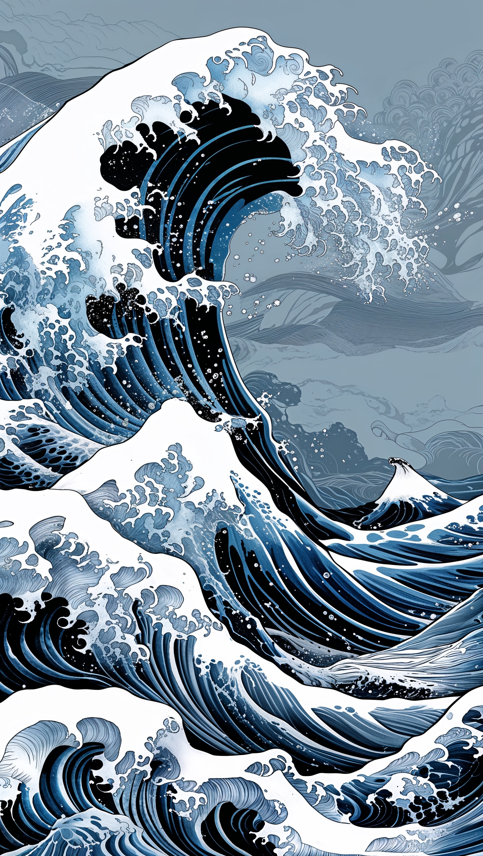 1664x2944 Stylized line art of ocean waves in Japanese Hokusai style