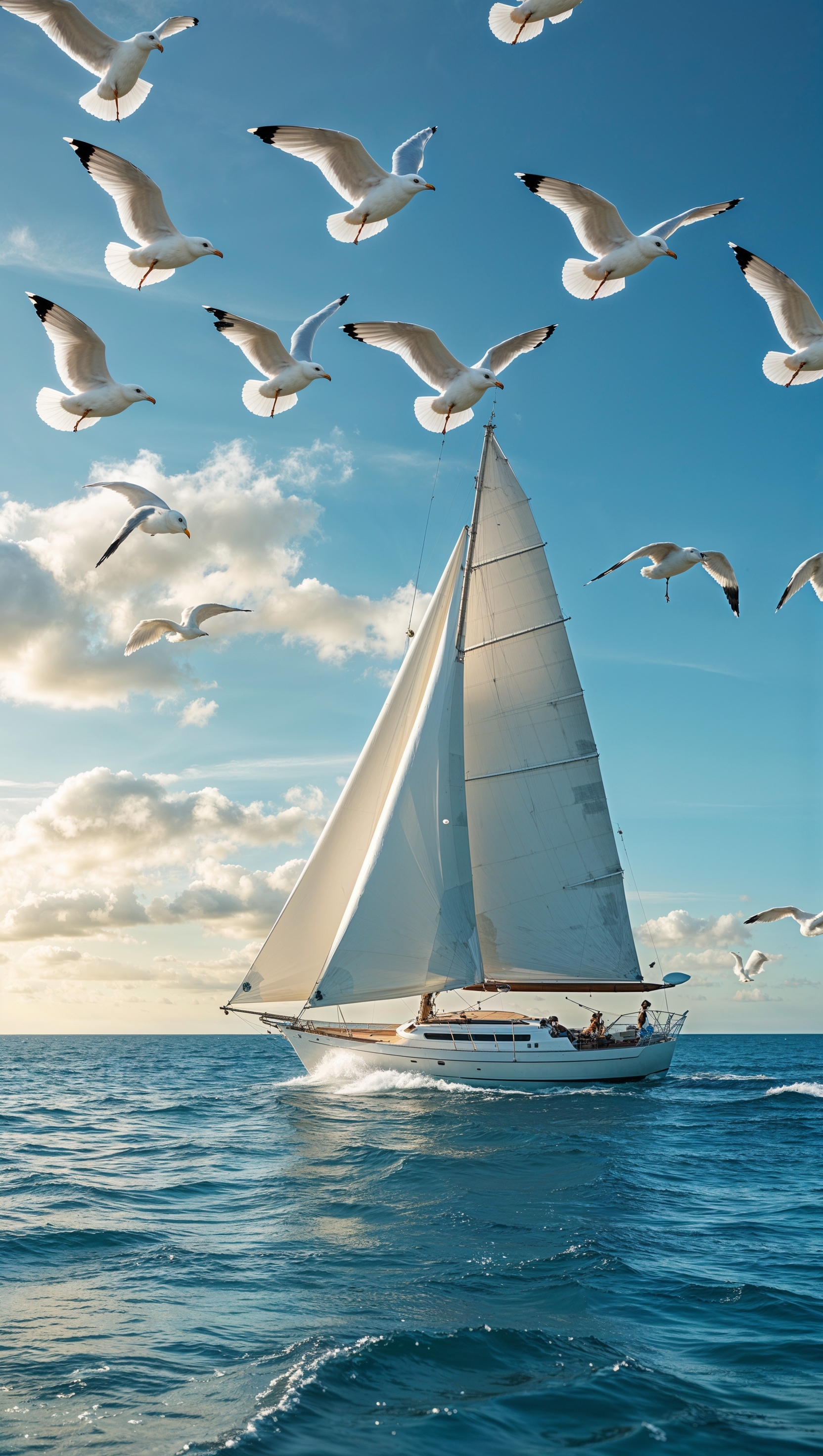 1664x2944 Ocean scene with sailboat in the distance and birds flying overhead