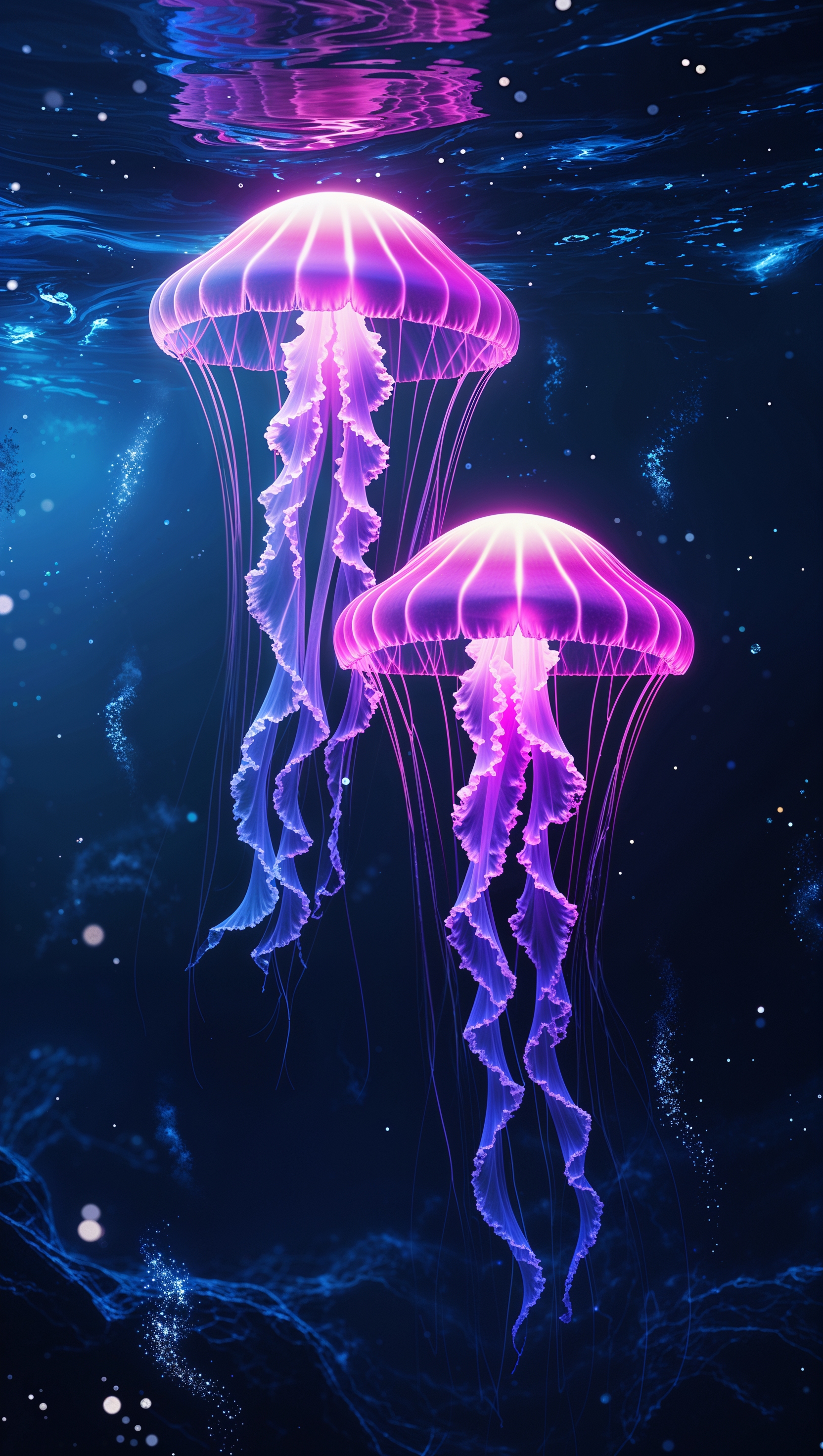 1664x2944 Ocean-themed digital art with glowing jellyfish floating in deep blue water