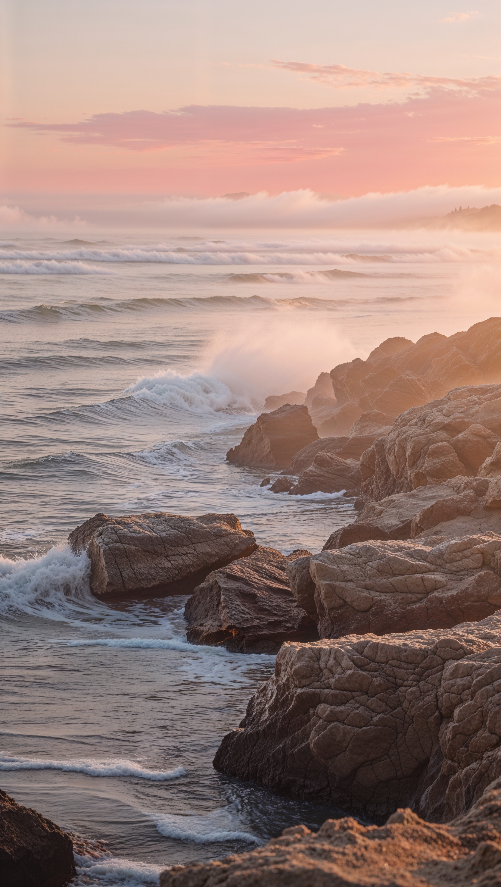1664x2944 Waves gently hitting rocks during golden hour, warm tones and peaceful mood