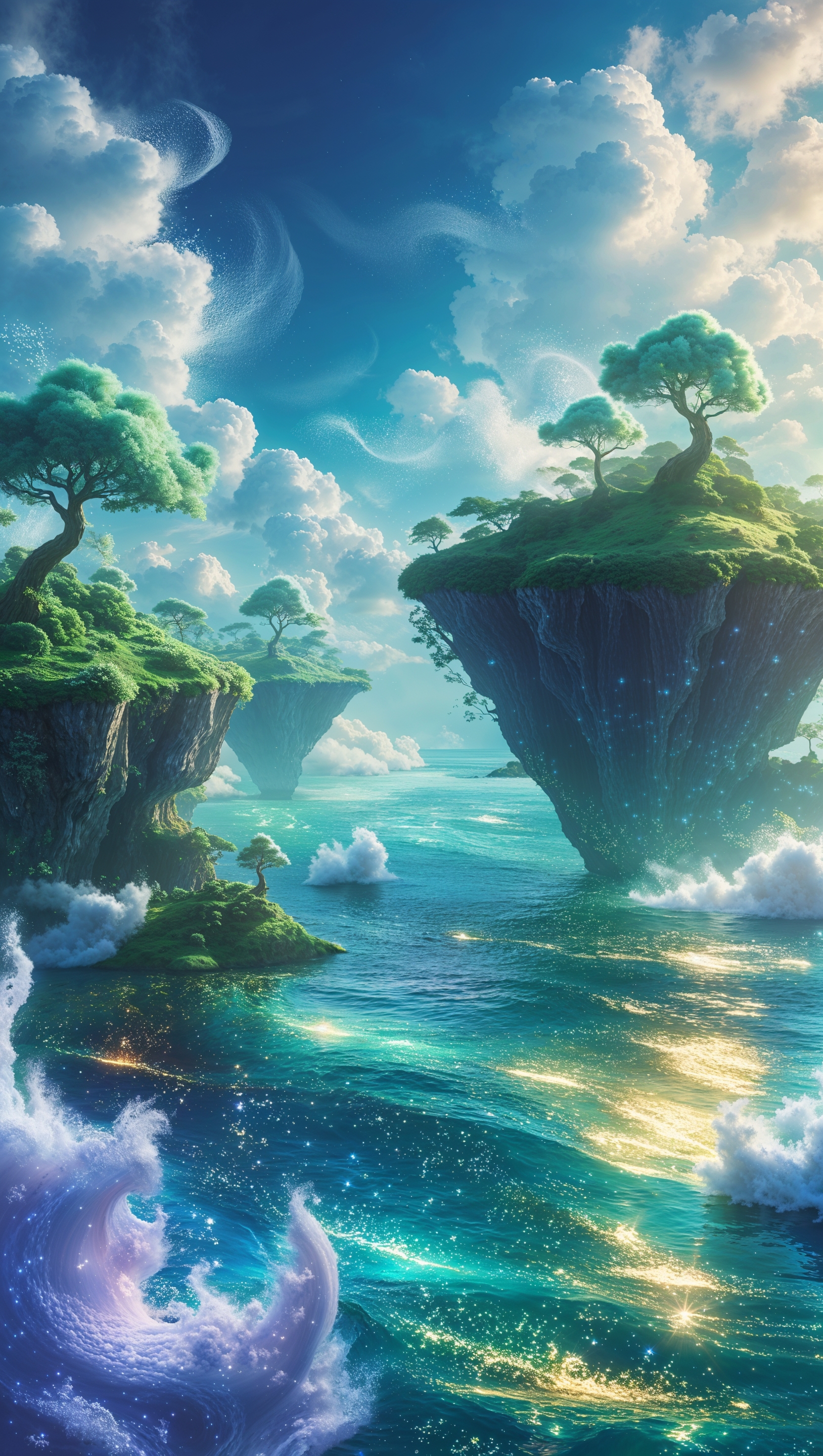 1664x2944 Fantasy-style ocean with floating islands and glowing water, surreal and imaginative
